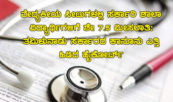 ವೈದ್ಯಕೀಯ ಕಾಲೇಜು ಪ್ರವೇಶದಲ್ಲಿ ಸರ್ಕಾರಿ ಶಾಲೆಗಳ ವಿದ್ಯಾರ್ಥಿಗಳಿಗೆ ಶೇ 7.5ರಷ್ಟು ಸೀಟುಗಳನ್ನು ಮೀಸಲಿಡುವ ತಮಿಳುನಾಡು ಸರ್ಕಾರದ ಕಾನೂನನ್ನು ಮದ್ರಾಸ್ ಹೈಕೋರ್ಟ್ ಗುರುವಾರ ಎತ್ತಿಹಿಡಿದಿದೆ.