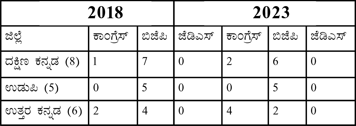 2018ರ ಚುನಾವಣೆಯಲ್ಲಿ ದಕ್ಷಿಣ ಕನ್ನಡದ 8 ಕ್ಷೇತ್ರಗಳ ಪೈಕಿ ಉಳ್ಳಾಲ(ಮಂಗಳೂರು)ದಲ್ಲಿ ಕಾಂಗ್ರೆಸ್ ಗೆದ್ದಿದ್ದು ಬಿಟ್ಟರೆ ಉಳಿದೆಲ್ಲ ಕ್ಷೇತ್ರ ಬಿಜೆಪಿ ವಶವಾಗಿತ್ತು; ಉಡುಪಿಯ ಐದಕ್ಕೆ ಐದೂ ಸ್ಥಾನ ಬಿಜೆಪಿ ಬುಟ್ಟಿಗೆ ಬಿದ್ದಿತ್ತು. ಉತ್ತರ ಕನ್ನಡದಲ್ಲಿ ಹಳಿಯಾಳ ಮತ್ತು ಯಲ್ಲಾಪುರ ಹೊರತುಪಡಿಸಿ ಉಳಿದ ನಾಲ್ಕು ಕ್ಷೇತ್ರದಲ್ಲಿ ಕಮಲ ಪಡೆ ಪಾರಮ್ಯ ಮೆರೆದಿತ್ತು. ಈ ಬಾರಿಯ ಚುನಾವಣಾ ಪೂರ್ವ ಅಥವಾ ಚುನಾವಣೋತ್ತರ ಸಮೀಕ್ಷೆಗಳಲ್ಲೂ ಸಹ ದಕ್ಷಿಣ ಕನ್ನಡ ಹಾಗು ಉಡುಪಿಯ 13 ಕ್ಷೇತ್ರಗಳಲ್ಲಿ ಕಾಂಗ್ರೆಸ್‌ಗೆ ದೊಡ್ಡ ಲಾಭ ಆಗಬಹುದೆಂಬ ನಿರೀಕ್ಷೆಗಳೇನೂ ಇರಲಿಲ್ಲ. ಆಡಳಿತ ವಿರೋಧಿ ಅಲೆಯನ್ನೂ ಮೀರಿದ ಹಿಂದುತ್ವದ ಸೆಳೆತ ದಕ್ಷಿಣ ಕರಾವಳಿಯಲ್ಲಿ ಗುಪ್ತಗಾಮಿಯಾಗಿ ಇರುವುದನ್ನು ಅಂದಾಜಿಸಲಾಗಿತ್ತು. ಅದರಂತೆ ಉಡುಪಿಯ ಎಲ್ಲ ಕ್ಷೇತ್ರಗಳನ್ನು ಮತ್ತೆ ಗೆದ್ದುಕೊಂಡ ಸಂಘ ಪರಿವಾರ ದಕ್ಷಿಣ ಕನ್ನಡದ ಆರು ಕ್ಷೇತ್ರದಲ್ಲಿ ಕಾಂಗ್ರೆಸ್‌ಅನ್ನು ಸುಲಭವಾಗಿ ಹಿಮ್ಮೆಟ್ಟಿಸಿದೆ.