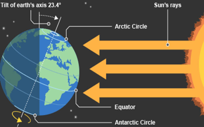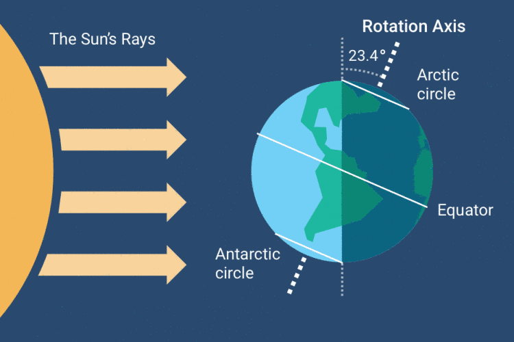 ಭೂಮಿಯ ಮೇಲೆ ವಿವಿಧ ಕಾಲಗಳು ಉಂಟಾಗಲು ಕಾರಣ ಭೂಮಿ ಸೂರ್ಯನಿಂದ ಹತ್ತಿರ ಮತ್ತು ದೂರ ಹೋಗುವುದರಿಂದಲ್ಲ ಬದಲಾಗಿ, ಭೂಮಿಯು ಸೂರ್ಯನ ಸುತ್ತ ತಿರುಗುತ್ತಿರುವ ಕಕ್ಷೆಯ ಲಂಭಕ್ಕೆ, ಭೂಮಿಯ ಅಕ್ಷವು 23.5 ಡಿಗ್ರಿ ಕೋನದಲ್ಲಿ ಬಾಗಿರುವುದರಿಂದ ಮತ್ತು ಭೂಮಿ ಸೂರ್ಯನ ಸುತ್ತು ಸುತ್ತುತ್ತಿದ್ದರೂ ಈ ಕೋನವು ಒಂದೇ ದಿಕ್ಕನಲ್ಲಿ ಮುಖ ಮಾಡಿರುತ್ತದೆ. ಈ ಕೋನದಿಂಲೇ, ಭೂಮಿಯ ಮೇಲೆ ಕಾಲಗಳು (seasons) ಬದಲಾಗುವುದು.