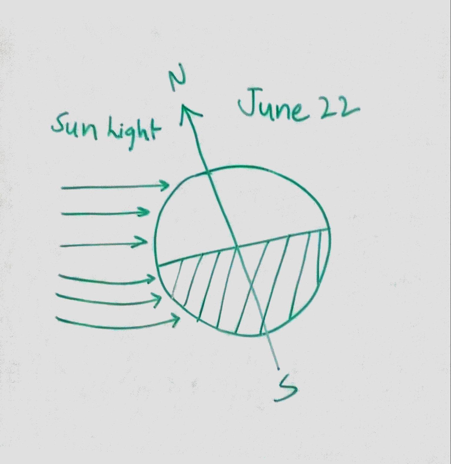 ಮತ್ತೊಂದು ವಿಸ್ಮಯದ ವಿಚಾರವೇಂದರೆ, ಉತ್ತರ ಗೋಳದಲ್ಲಿ ಬೇಸಿಗೆ ಕಾಲ ಇರುವಾಗ ಅಂದರೆ ನಮಗೆ ಬೇಸಿಗೆ ಕಾಲ ಇರುವಾಗ, ಭೂಮಿಯು ಸೂರ್ಯನಿಂದ ದೂರದಲ್ಲಿರುತ್ತಾನೆ! ಆದರೂ ನಮಗೆ ಬೇಸಿಗೆ ಕಾಲವಿರುತ್ತದೆ. ಏಕೆಂದರೆ, ಈ 23.5 ಡಿಗ್ರಿ ಕೋನವು ಆ ಸ್ಥಾನದಲ್ಲಿ ಸೂರ್ಯವಿರುವ ದಿಕ್ಕೆಗೆ ಬಾಗಿದ್ದು, ಉತ್ತರ ಗೋಳದಲ್ಲಿ ಸೂರ್ಯನ ಕಿರಣ ನೇರವಾಗಿ ಬೀಳುತ್ತಿರುತ್ತದೆ, ದಕ್ಷಿಣ ಗೋಳದಲ್ಲಿ ನೇರವಾಗಿ ಬೀಳದೆ, ಸೂರ್ಯನ ವಿರುದ್ಧ ದಿಕ್ಕಿನಲ್ಲಿ ಬಾಗಿರುತ್ತದೆ. ಆದುದರಿಂದ, ಉತ್ತರ ಗೋಳದಲ್ಲಿ ಬೇಸಿಗೆ ಕಾಲ, ದಕ್ಷಿಣ ಗೋಳದಲ್ಲಿ ಚಳಿಗಾಲ! ಹಾಗಾಗಿ, ಯಾವುದೇ ಸಂದರ್ಭದಲ್ಲಿ, ಭೂಮಿಯ 23.5 ಡಿಗ್ರಿ ಭಾಗುವಿಕೆಯ ಕಾರಣದಿಂದಾಗಿ, ಭೂಮಿಯ ಉತ್ತರ ಗೋಳದಲ್ಲಿ ಯಾವ ಕಾಲವಿರುವುದೋ, ದಕ್ಷಿಣ ಗೋಳದಲ್ಲಿ ಅದರ ವಿರುದ್ಧ ಕಾಲವಿರುತ್ತದೆ.