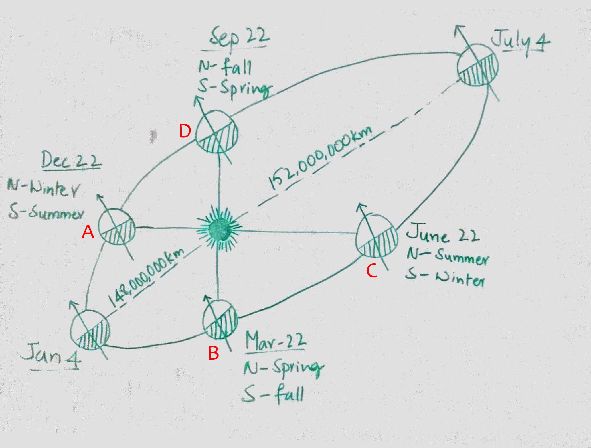 ನಮಗೆಲ್ಲರಿಗೂ ತಿಳಿದಿರುವಹಾಗೆ ಭೂಮಿ ಸೂರ್ಯನ ಸುತ್ತ ಗೋಳಾಕಾರದಲ್ಲಿ ಸುತ್ತುತ್ತಿದೆ. ಅಲ್ಲದೇ, ಆ ಗೋಳಾಕಾರಕ್ಕೆ ಎರಡು ಕೇಂದ್ರ ಬಿಂದು ಇದ್ದು, ಸೂರ್ಯನು ಒಂದು ಕೇಂದ್ರ ಬಿಂದುವಿನಲ್ಲಿದ್ದಾನೆ ಎಂಬುದು ತಿಳಿದಿದೆ. ಹಾಗಿದ್ದಾಗ, ಭೂಮಿಯು ಸೂರ್ಯನ ಸುತ್ತ ಸುತ್ತವಾಗ, ವರ್ಷದ ಕೆಲವು ತಿಂಗಳು ಸೂರ್ಯನಿಂದ ದೂರ ಮತ್ತು ಕೆಲವು ತಿಂಗಳು ಸೂರ್ಯನ ಹತ್ತಿರ ಬರುವುದು ಸಹಜ. ಆದರೆ, ಭೂಮಿಯು ಸೂರ್ಯನಿಂದ ದೂರವಿದ್ದಾಗಿನ ಅಂತರ ಮತ್ತು ಹತ್ತಿರವಿದ್ದಾಗಿನ ಅಂತರವನ್ನು ತೆಗೆದುಕೊಂಡು ಅದರ ವ್ಯತ್ಯಾಸ ನೋಡಿದರೆ, ಕೇವಲ ಶೇ.2ರಷ್ಟು ಮಾತ್ರ ಬದಲಾಗುತ್ತದೆ. ಅಂದರೆ, ಖಗೋಳ ವಿಜ್ಞಾನದ ಮಾಪನದಲ್ಲಿ ಶೇ.೨ರಷ್ಟು ವ್ಯತ್ಯಾಸ ಅತೀ ಕಡಿಮೆಯದ್ದು. ಇದು ಭೂಮಿಗೆ ಭೌತಿಕವಾಗಿ ಅಥವಾ ಭೂಮಿಯ ವಾತಾವರಣಕ್ಕೆ ಯಾವ ಬದಲಾವಣೆಯನ್ನು ತರುವುದಿಲ್ಲ. ಈ ಅಂತರವು ಭೂಮಿಯಲ್ಲಿ ಬೇಸಿಗೆ ಕಾಲ, ಚಳಿ ಕಾಲ ಮತ್ತು ಮಳೆ ಕಾಲ ಎಂಬ ಯಾವ ಋತು ಬದಲಾವಣೆಯನ್ನು ಉಂಟುಮಾಡುವುದಿಲ್ಲ. ಹಾಗಾದರೆ, ಭೂಮಿಯ ಮೇಲೆ ಕಾಲಗಳು (seasons) ಹೇಗೆ ಉಂಟಾಗುತ್ತವೆ?