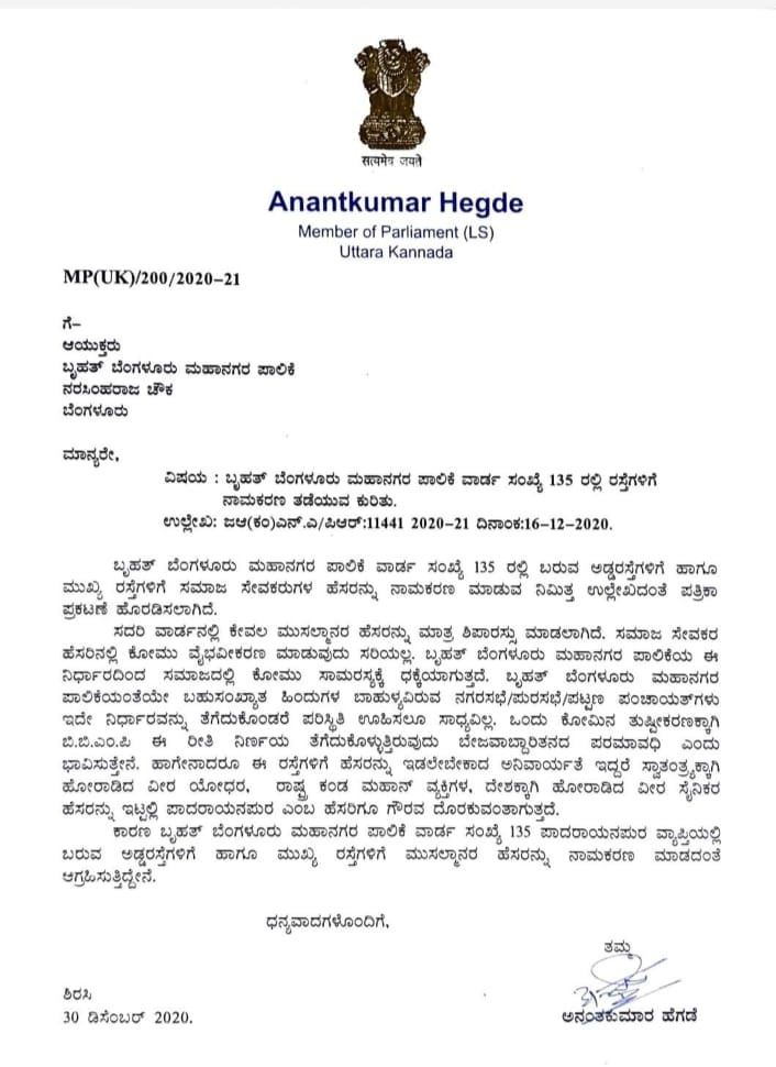 ಬೆಂಗಳೂರಿನ ಪಾದರಾಯನಪುರದ ರಸ್ತೆಗಳಿಗೆ ಮುಸ್ಲಿಮರ ಹೆಸರುಗಳನ್ನಿಡುವ ಬೆಂಗಳೂರು ಮಹಾನಗರ ಪಾಲಿಕೆ (ಬಿಬಿಎಂಪಿ)ಯ ತೀರ್ಮಾನಕ್ಕೆ ಸಂಸದ ಹಾಗೂ ಕೇಂದ್ರದ ಮಾಜಿ ಸಚಿವ ಅನಂತಕುಮಾರ್ ಹೆಗ್ಡೆ ವಿರೋಧ ವ್ಯಕ್ತಪಡಿಸಿದ್ದಾರೆ. “ರಸ್ತೆಗಳಿಗೆ ಮುಸ್ಲಿಂ ಸಮಾಜ ಸೇವಕರ ಹೆಸರಿಟ್ಟರೆ ಕೋಮು ಸಾಮರಸ್ಯ ಹದಗೆಡುತ್ತದೆ” ಎಂದು ಪತ್ರ ಬರೆದಿದ್ದಾರೆ.