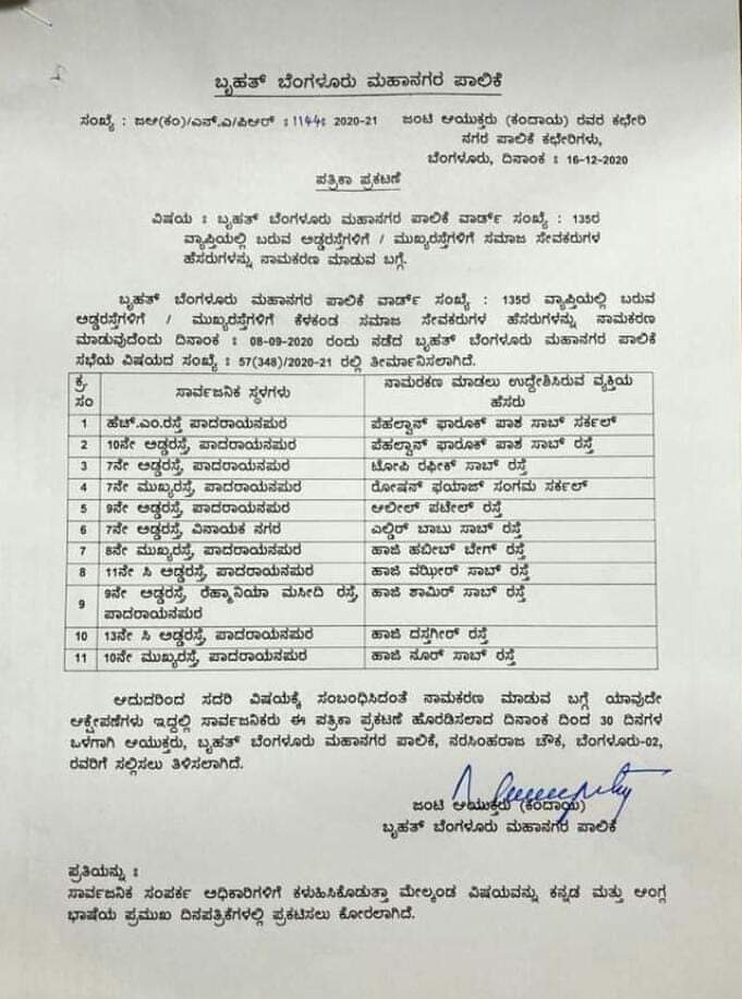 “ಪಾದರಾಯನಪುರದ ಅಡ್ಡ ರಸ್ತೆಗಳಿಗೆ ಸಮಾಜ ಸೇವಕರ ಹೆಸರಿಡಬೇಕೆನ್ನುವ ನಿರ್ಣಯ ಕೈಗೊಳ್ಳಲಾಗಿತ್ತು. ಆದರೆ, ಈಗ ಸಮಾಜ ಸೇವಕರ ಹೆಸರಿನಲ್ಲಿ ಮುಸ್ಲಿಮರ ಹೆಸರುಗಳನ್ನು ಮಾತ್ರ ಶಿಫಾರಸ್ಸು ಮಾಡಲಾಗಿದೆ. ಈ ಮೂಲಕ ಒಂದು ಕೋಮಿನ ತುಷ್ಠೀಕರಣಕ್ಕೆ ಮುಂದಾಗುವುದು ಸರಿಯಲ್ಲ. ಇದು ಸಮಾಜದಲ್ಲಿ ಕೋಮು ಸಾಮರಸ್ಯಕ್ಕೆ ಧಕ್ಕೆಯುಂಟುಮಾಡುತ್ತದೆ” ಎಂದು ಹೇಳಿದ್ದಾರೆ.
