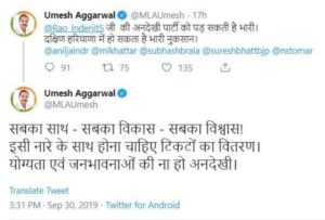 ಬಿಜೆಪಿಯಲ್ಲಿ ಸಂಸದ ಇಂದ್ರಜಿತ್ ಸಿಂಗ್ ತಮ್ಮ ಮಗಳಿಗೆ ಟಿಕೆಟ್ ಕೊಡಬೇಕು ಎಂದು ಪಟ್ಟು ಹಿಡಿದಿದ್ದಾರೆ. ಇದಕ್ಕೆ ಗುರುಗ್ರಾಮ್ ಶಾಸಕ ಉಮೇಶ್ ಅಗರವಾಲ್ ಆಕ್ಷೇಪ ವ್ಯಕ್ತಪಡಿಸಿದ್ದಾರೆ. ಅಲ್ಲದೇ ಟ್ವೀಟ್ ಮೂಲಕ ಸಬಕಾ ಸಾಥ್, ಸಬಕಾ ವಿಕಾಸ್, ಸಬಕಾ ವಿಶ್ವಾಸ ಈ ಘೋಷಣೆಯನ್ನು ಮೂಲವಾಗಿಟ್ಟುಕೊಂಡೇ ಟಿಕೆಟ್ ಹಂಚಿಕೆಯಾಗಬೇಕು. ಯೋಗ್ಯತೆ, ಸಾಮರ್ಥ್ಯ ಹಾಗೂ ಜನಾನುಭಾವ ಎಲ್ಲವನ್ನೂ ಗಮನದಲ್ಲಿಟ್ಟುಕೊಂಡು ಪಕ್ಷ ಟಿಕೆಟ್ ಹಂಚಿಕೆ ಮಾಡಬೇಕು ಎಂದಿದ್ದಾರೆ.