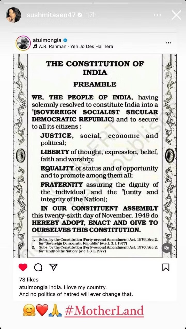 #Motherland ಎಂಬ ಹ್ಯಾಶ್ ಟ್ಯಾಗ್ ಬಳಸಿ ಅತುಲ್ ಮೊಂಗಿಯಾ ಪೋಸ್ಟ್ ಮಾಡಿದ್ದ ಸಂವಿಧಾನದ ಪೀಠಿಕೆಯ ಚಿತ್ರ ಹೊಂದಿದ್ದ ಇನ್ಸ್ಟಾಗ್ರಾಂ ಪೋಸ್ಟ್ ಅನ್ನು ಸುಶ್ಮಿತಾ ಸೇನ್ ಮರು ಪೋಸ್ಟ್ ಮಾಡಿದ್ದರು.