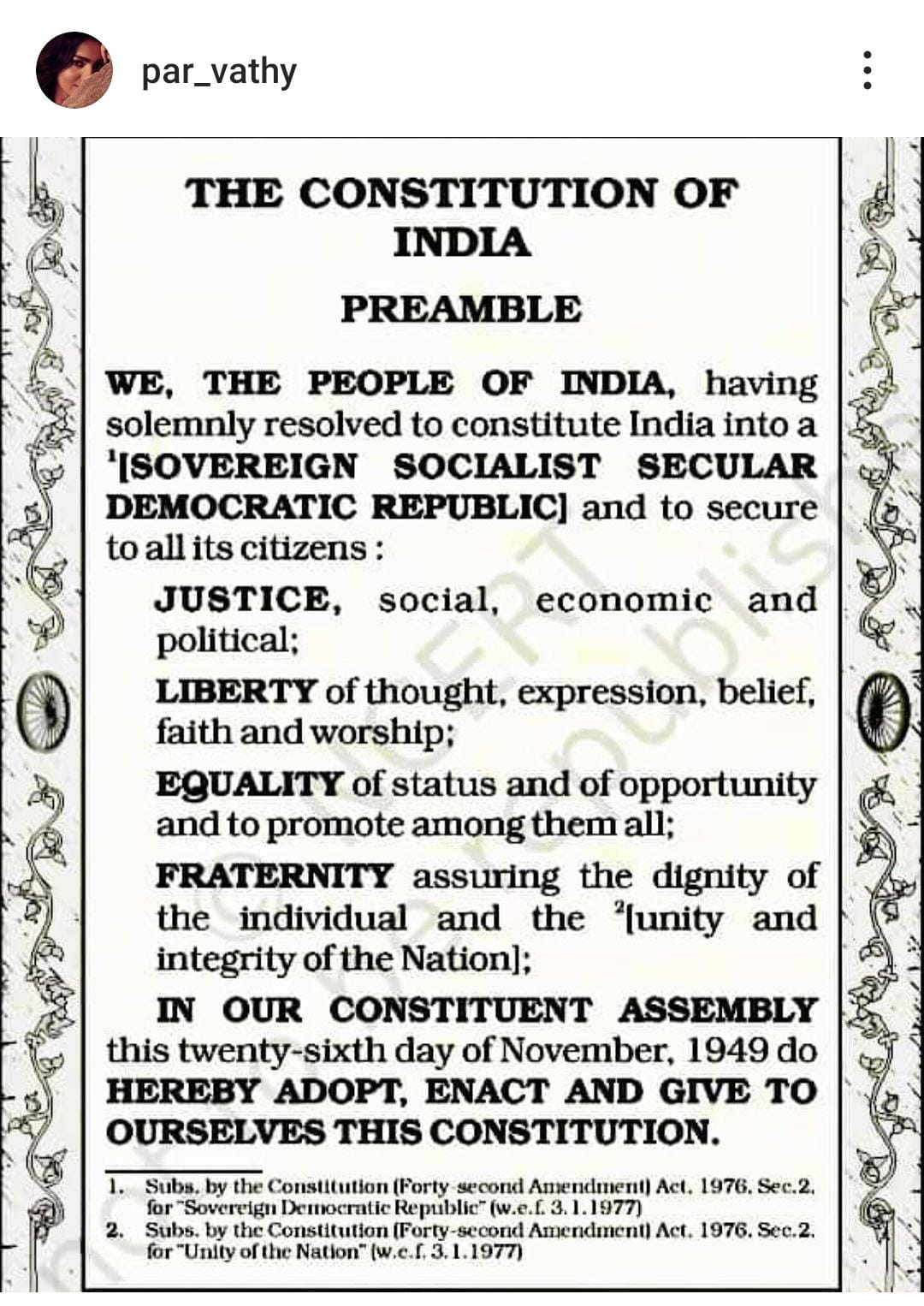 ಸಾವಿಂಧಾನಿಕ ಹುದ್ದೆಯಲ್ಲಿರುವ ಪ್ರಧಾನಿ ನರೇಂದ್ರ ಮೋದಿ ಸೇರಿದಂತೆ ಅನೇಕರು ಅಯೋಧ್ಯೆ ರಾಮಮಂದಿರ ಉದ್ಘಾಟನೆಯ ವಿಧಿ ವಿಧಾನಗಳ ನೇತೃತ್ವ ವಹಿಸಿದ್ದ ದಿನ ಭಾರತೀಯ ಚಿತ್ರರಂಗದ ಹಲವು ನಟ, ನಟಿಯರು ಸಂವಿಧಾನದ ಪೀಠಿಕೆಯನ್ನು ಹಂಚಿಕೊಂಡಿದ್ದರು.