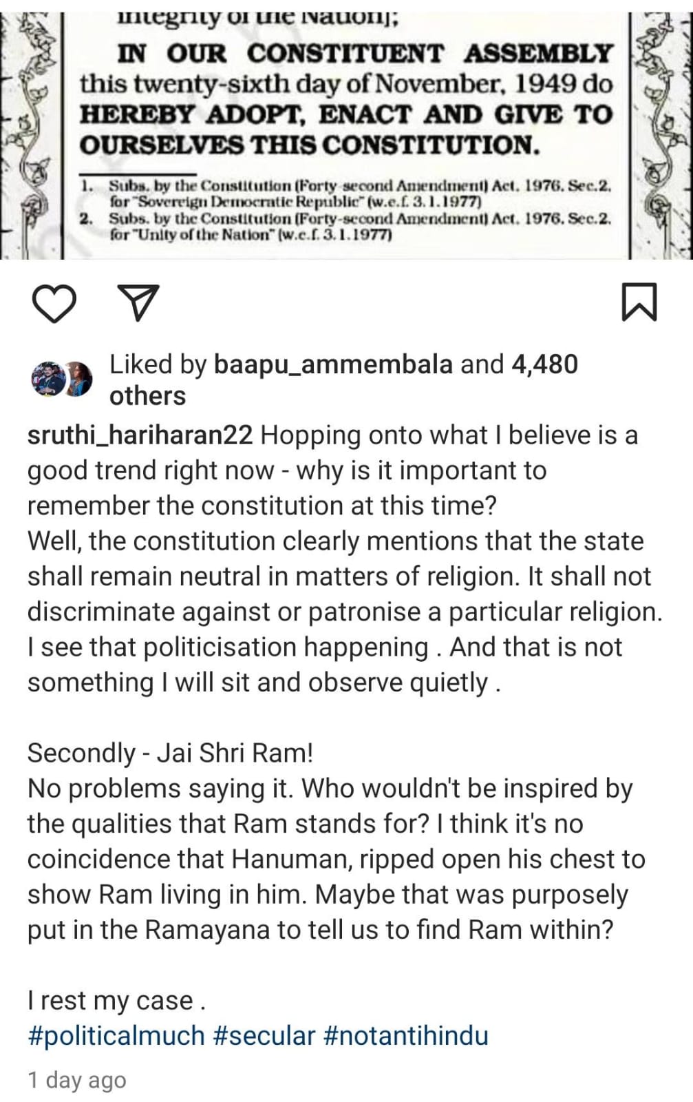 “ಈ ಸನ್ನಿವೇಶದಲ್ಲಿ ಯಾವುದು ಉತ್ತಮವೋ ಅದರಲ್ಲೇ ಸಾಗುವುದು ಉತ್ತಮ ಎಂಬ ನಂಬಿಕೆ ನನ್ನದು. ಹೀಗಾಗಿ ಈ ಸಂದರ್ಭದಲ್ಲಿ ಸಂವಿಧಾನವನ್ನು ನೆನೆಯುವುದು ನನಗೆ ಅತ್ಯಗತ್ಯ ಎಂದೆನಿಸಿದೆ. ಯಾಕೆಂದೆ ಧರ್ಮದ ವಿಷಯದಲ್ಲಿ ದೇಶವು ತಟಸ್ಥವಾಗಿರಬೇಕು. ಯಾವುದೇ ನಿರ್ದಿಷ್ಟ ಧರ್ಮವನ್ನು ಪೋಷಿಸುವುದು ಅಥವಾ ಅದರ ವಿರುದ್ಧ ತಾರತಮ್ಯ ಮಾಡುವುದನ್ನೂ ಮಾಡಬಾರದು ಎಂದು ಸಂವಿಧಾನದಲ್ಲಿ ಹೇಳಲಾಗಿದೆ. ಆದರೆ, ಇಂದು ಧರ್ಮವನ್ನು ರಾಜಕೀಯಗೊಳಿಸಲಾಗುತ್ತಿದೆ. ಇದನ್ನು ನೋಡಿಯೂ ಸುಮ್ಮನೆ ಕೂತು, ಗಮನಿಸುವುದೂ ಸರಿಯಲ್ಲ” ಎಂದು ಶ್ರುತಿ ಹೇಳಿದ್ದರು.