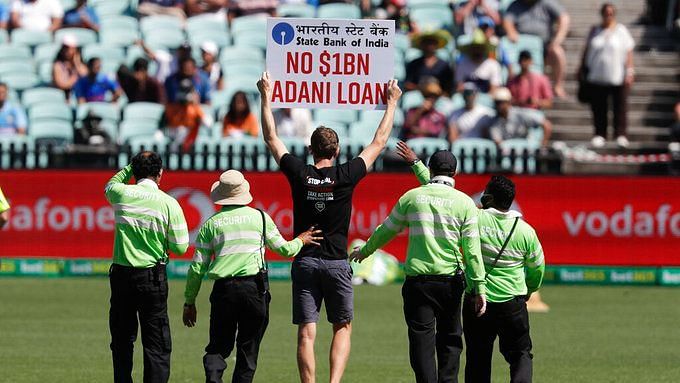 ಆಸ್ಟ್ರೇಲಿಯಾದ ಸಿಡ್ನಿಯಲ್ಲಿ ಇಂದು ಭಾರತ-ಆಸ್ಟ್ರೇಲಿಯಾ ಮೊದಲ ಏಕದಿನ ಕ್ರಿಕೆಟ್ ಪಂದ್ಯ ಆರಂಭವಾಗಿದೆ. ಪಂದ್ಯ ವೀಕ್ಷೀಸಲು ಕ್ರೀಡಾಂಗಣಕ್ಕೆ ಪ್ರೇಕ್ಷಕರಿಗೂ ಅವಕಾಶ ಕಲ್ಪಿಸಲಾಗಿದೆ. ಈ ಸಂದರ್ಭದಲ್ಲಿ ಇಬ್ಬರು ಪ್ರತಿಭಟನಾಕಾರರು ಪಂದ್ಯ ನಡೆಯುತ್ತಿರುವ ಸಮಯದಲ್ಲಿಯೇ ಮೈದಾನದೊಳಕ್ಕೆ ನುಗ್ಗಿ ಅದಾನಿಗೆ ವಿವಾದಿತ ಕಲ್ಲಿದ್ದಲು ಯೋಜನೆ ನೀಡುವುದರ ವಿರುದ್ಧ ಪ್ರತಿಭಟಿಸಿ ಗಮನಸೆಳೆದಿದ್ದಾರೆ.