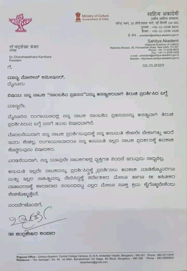 “ಎರಡನೆಯದಾಗಿ, ನನ್ನ ಯಾವುದೇ ನಾಟಕಗಳಲ್ಲಿ ವ್ಯಕ್ತಿಗಳ ನಿಂದನೆ ಇರುವುದು ಸಾಧ್ಯವಿಲ್ಲ. ಅನುಮತಿ ಇಲ್ಲದೇ ನಾಟಕವನ್ನು ಪ್ರದರ್ಶಿಸಿದ್ದಕ್ಕೆ, ಪ್ರದರ್ಶಿಸಲು ಅವಕಾಶ ಮಾಡಿಕೊಟ್ಟವರಿಗೂ ಮತ್ತು ಇಲ್ಲದ ಸಾಹಿತ್ಯವನ್ನು ಸೇರಿಸಿದ್ದಕ್ಕೆ ನಿರ್ದೇಶಕರ ಮೇಲೂ ಈ ಅಹಿತಕರ ವಾತಾವರಣಕ್ಕೆ ಕಾರಣರಾದ, ಸಂಬಂಧಪಟ್ಟ ಎಲ್ಲರ ಮೇಲೂ, ಸೂಕ್ತ ಕ್ರಮ ಕೈಗೊಳ್ಳಬೇಕು” ಎಂದು ಅವರು ಕೋರಿದ್ದಾರೆ.