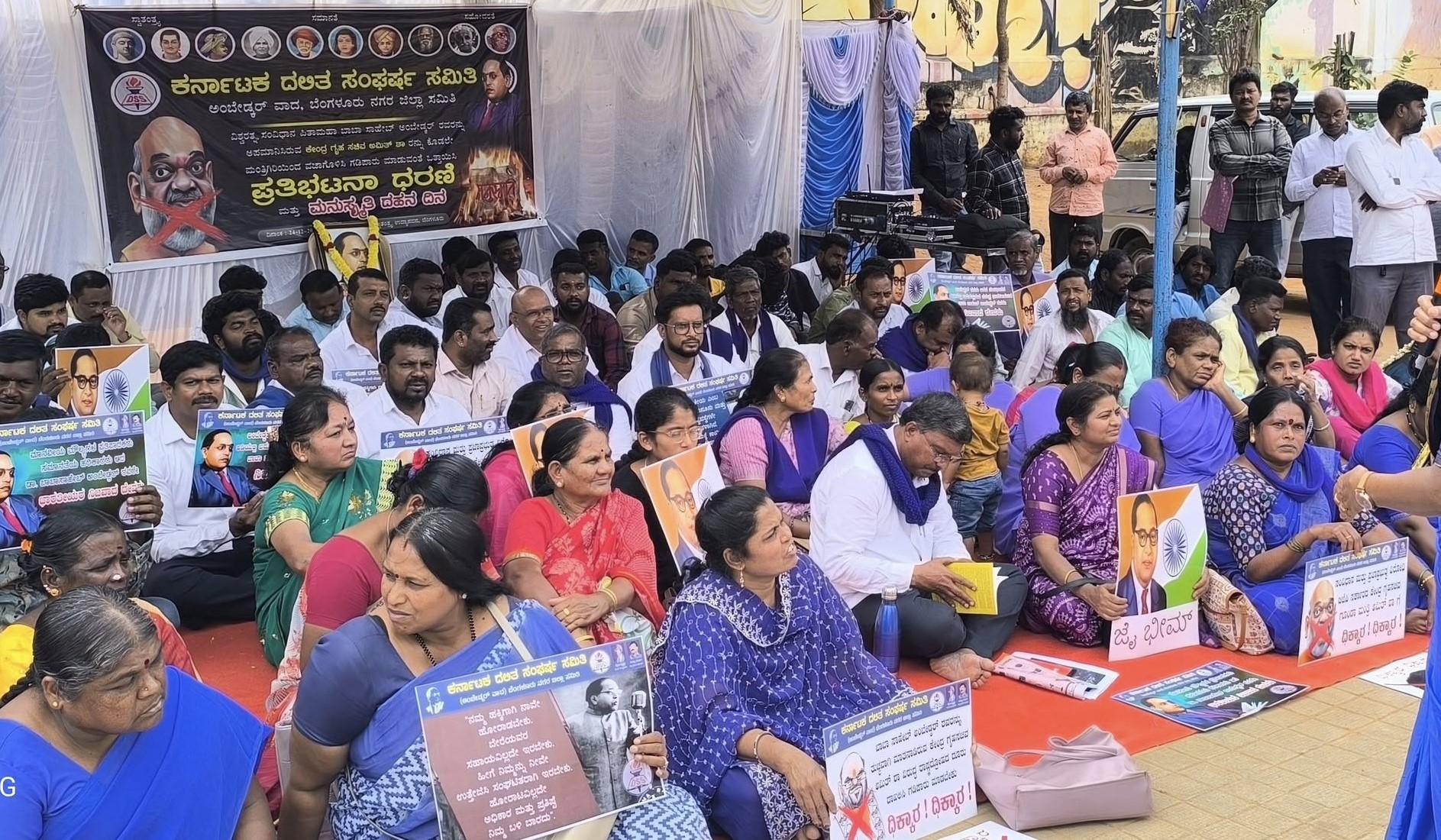 ಅಂಬೇಡ್ಕರ್ ಅವರನ್ನು ಅಪಮಾನಿಸಿರುವ ಅಮಿತ್ ಶಾ ವಿರುದ್ಧ ಆಕ್ರೋಶ ಹೊರಹಾಕಿದ ದಸಂಸ ಕಾರ್ಯಕರ್ತರು, ‘ಅಮಿತ್ ಶಾ ಕೇಡಿ – ಹಾಕ್ರಿ ಅವನಿಗೆ ಬೇಡಿ’ ಎಂಬಿತ್ಯಾದಿ ಘೋಷಣೆ ಕೂಗಿದರು. ಚಪ್ಪಲಿ ಬಿಡುವ ಜಾಗದಲ್ಲಿ ಅಮಿತ್ ಶಾ ಮತ್ತು ಸಿಟಿ ರವಿ ಫೋಟೋಗಳನ್ನು ಇಟ್ಟು ಪ್ರತಿರೋಧ ತೋರಿದರು. ಅಮಿತ್ ಶಾ ಅವರ ಪ್ರತಿಕೃತಿ ಸುಟ್ಟು ಆಕ್ರೋಶ ವ್ಯಕ್ತಪಡಿಸಿದರು.
