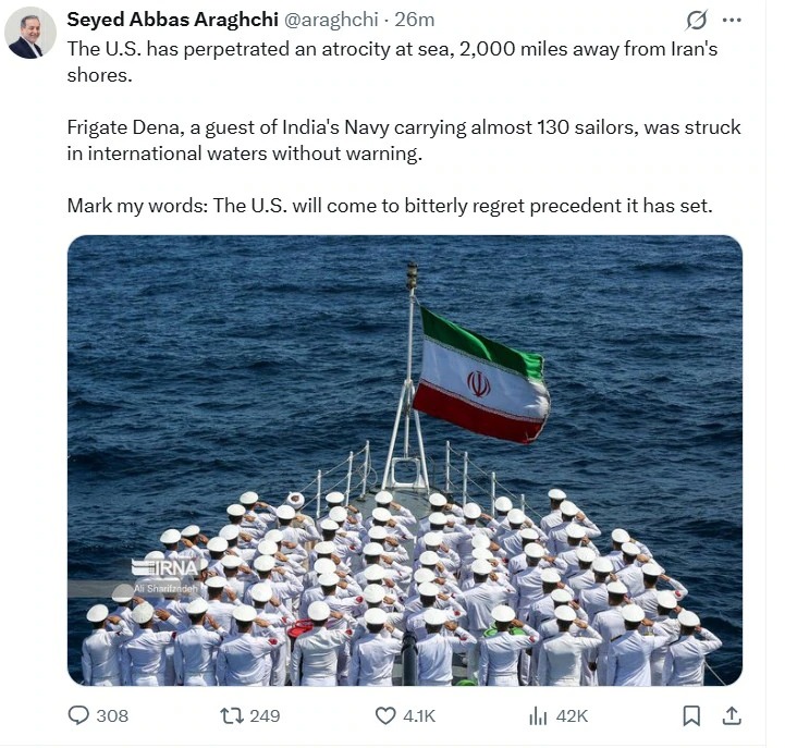 ಇರಾನ್ ವಿದೇಶಾಂಗ ಸಚಿವ ಸೈಯದ್ ಅಬ್ಬಾಸ್ ಅರಾಗ್ಚಿ ಈ ದಾಳಿಯನ್ನು ‘ಸಮುದ್ರದಲ್ಲಿ ನಡೆದ ದೌರ್ಜನ್ಯ’ ಎಂದಿದ್ದು, ಈ ಕೃತ್ಯಕ್ಕಾಗಿ ಅಮೆರಿಕ ಭಾರೀ ಪಶ್ಚಾತ್ತಾಪ ಪಡಲಿದೆ ಎಂದು ಅವರು ಕಟುವಾಗಿ ಎಚ್ಚರಿಸಿದ್ದಾರೆ.
