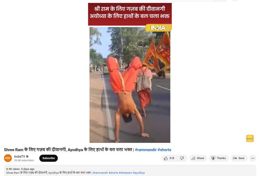 ಹಲವು ಮಂದಿ ಸಾಮಾಜಿಕ ಜಾಲತಾಣ, ಯೂಟ್ಯೂಬ್ ಬಳಕೆದಾರರು ಈ ವಿಡಿಯೋವನ್ನು ಹಂಚಿಕೊಂಡು “ಕಾಲಿನ ಬದಲಾಗಿ ಕೈಯ್ಯಿಂದ ಅಯೋಧ್ಯೆಗೆ ತೆರಳುತ್ತಿರುವ ರಾಮಭಕ್ತ ಎಂದಿದ್ದಾರೆ.