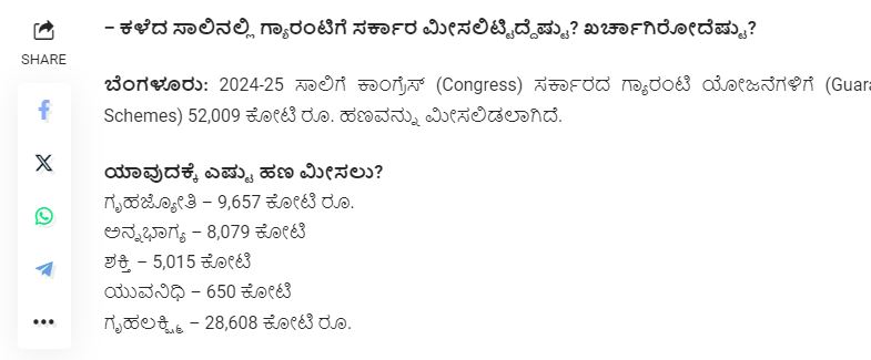 ಐದು ಗ್ಯಾರಂಟಿ ಯೋಜನೆಗಳಿಗೆ 2024-25 ಸಾಲಿನ ಬಜೆಟ್ನಲ್ಲಿ ರಾಜ್ಯ ಸರ್ಕಾರ 52 ಸಾವಿರ ಕೋಟಿ ರೂ. ಮೀಸಲಿಟ್ಟಿದೆ. ಈ ಪೈಕಿ ಗೃಹಜ್ಯೋತಿ ಯೋಜನೆಗೆ 9,657 ಕೋಟಿ ರೂ., ಅನ್ನಭಾಗ್ಯ ಯೋಜನೆಗೆ 8,079 ಕೋಟಿ ರೂ., ಶಕ್ತಿ ಯೋಜನೆಗೆ 5,015 ಕೋಟಿ ರೂ., ಯುವನಿಧಿ ಯೋಜನೆಗೆ 650 ಕೋಟಿ ರೂ., ಮತ್ತು ಗೃಹಲಕ್ಷ್ಮಿ ಯೋಜನೆಗೆ 28,608 ಕೋಟಿ ರೂ. ನೀಡಿದೆ. ಹಾಗಾಗಿ, ಇಲ್ಲಿ ಕೇಂದ್ರದ ಅನುದಾನದ ಅವಶ್ಯಕತೆ ಇಲ್ಲ. ನಿವೃತ್ತಿ ವೇತನದಲ್ಲಿ ಕೇಂದ್ರದ ಸರ್ಕಾರದ ಪಾಲು ರೂ. 550 ಕೋಟಿ ಇದೆ.