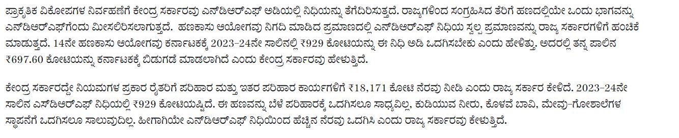 ಈ ಲೇಖನದಲ್ಲಿ “ಕೇಂದ್ರ ಸರ್ಕಾರದ್ದೇ ನಿಯಮಗಳ ಪ್ರಕಾರ ರೈತರಿಗೆ ಪರಿಹಾರ ಮತ್ತು ಇತರ ಪರಿಹಾರ ಕಾರ್ಯಗಳಿಗೆ ರೂ. 18,171 ಕೋಟಿ ನೆರವು ನೀಡಿ ಎಂದು ರಾಜ್ಯ ಸರ್ಕಾರ ಕೇಳಿದೆ. 2023–24ನೇ ಸಾಲಿನ ಎಸ್ಡಿಆರ್ಎಫ್ ನಿಧಿಯಲ್ಲಿ ರೂ. 929 ಕೋಟಿಯಷ್ಟಿದೆ. ಈ ಹಣವನ್ನು ಬೆಳೆ ಪರಿಹಾರಕ್ಕೆ ಒದಗಿಸಲೂ ಸಾಧ್ಯವಿಲ್ಲ, ಕುಡಿಯುವ ನೀರು, ಕೊಳವೆ ಬಾವಿ, ಮೇವು–ಗೋಶಾಲೆಗಳ ಸ್ಥಾಪನೆಗೆ ಒದಗಿಸಲೂ ಸಾಲುವುದಿಲ್ಲ. ಹೀಗಾಗಿಯೇ ಎನ್ಡಿಆರ್ಎಫ್ ನಿಧಿಯಿಂದ ಹೆಚ್ಚಿನ ನೆರವು ಒದಗಿಸಿ ಎಂದು ರಾಜ್ಯ ಸರ್ಕಾರವು ಕೇಳುತ್ತಿದೆ” ಎನ್ನಲಾಗಿದೆ.