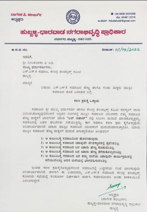 ಸೋಮವಂಶ ಸಹಾಸ್ರಾರ್ಜುನ ಕ್ಷತ್ರಿಯ (ಎಸ್ಎಸ್ಕೆ) ಸಮಾಜದ ಮುಖ್ಯ ಧರ್ಮದರ್ಶಿಗೆ ಹುಬ್ಬಳ್ಳಿ-ಧಾರವಾಡ ನಗರಾಭಿವೃದ್ಧಿ ಪ್ರಾಧಿಕಾರದ ಅಧ್ಯಕ್ಷ ನಾಗೇಶ್ ಕಲಬುರ್ಗಿಯವರು ಪತ್ರ ಬರೆದಿದ್ದು, ಎಸ್ಎಸ್ಕೆ ಸಮಾಜದ ಹೆಣ್ಣು ಹಾಗೂ ಗಂಡು ಮಕ್ಕಳು ಮುಸ್ಲಿಂ ಸಮಾಜದ ಜೊತೆ ವಿವಾಹವಾದರೆ ಸಾಮಾಜಿಕ ಬಹಿಷ್ಕಾರ ಹಾಕಬೇಕೆಂದು ಸಲಹೆ ನೀಡಿದ್ದಾರೆ.