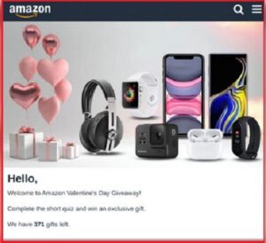 ನೀವು ತಲುಪುವ ಪುಟವು ಅಮೆಜಾನ್ ಬ್ಯಾನರ್, ವಿವಿಧ ಎಲೆಕ್ಟ್ರಾನಿಕ್ಸ್‌ಗಳ ಛಾಯಾಚಿತ್ರವನ್ನು ಹೊಂದಿದೆ. ವಿಶೇಷ ಉಡುಗೊರೆಯನ್ನು ಗೆಲ್ಲಲು ಸಣ್ಣ ರಸಪ್ರಶ್ನೆಯನ್ನು ಪೂರ್ಣಗೊಳಿಸಲು ಕೇಳಲಾಗುತ್ತದೆ.