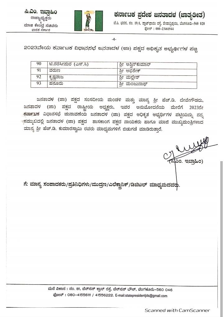 2023ರ ಕರ್ನಾಟಕ ವಿಧಾನಸಭಾ ಚುನಾವಣೆಗೆ ಜೆಡಿಎಸ್ ಪಕ್ಷವು 93 ಸ್ಥಾನಗಳಿಗೆ ಟಿಕೆಟ್ ಘೋಷಿಸಿದೆ. ಪಟ್ಟಿಯನ್ನು ಜೆಡಿಎಸ್ ಟ್ವೀಟ್ ಮಾಡಿದ್ದು, ಅದರ ವಿವರಗಳು ಇಲ್ಲಿವೆ.