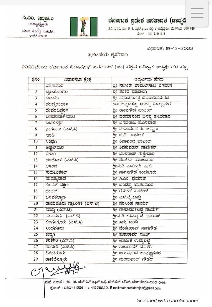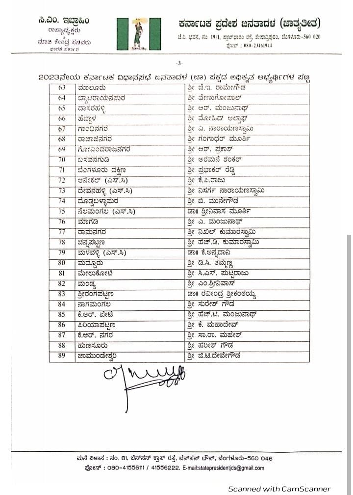 2023ರ ಕರ್ನಾಟಕ ವಿಧಾನಸಭಾ ಚುನಾವಣೆಗೆ ಜೆಡಿಎಸ್ ಪಕ್ಷವು 93 ಸ್ಥಾನಗಳಿಗೆ ಟಿಕೆಟ್ ಘೋಷಿಸಿದೆ. ಪಟ್ಟಿಯನ್ನು ಜೆಡಿಎಸ್ ಟ್ವೀಟ್ ಮಾಡಿದ್ದು, ಅದರ ವಿವರಗಳು ಇಲ್ಲಿವೆ.