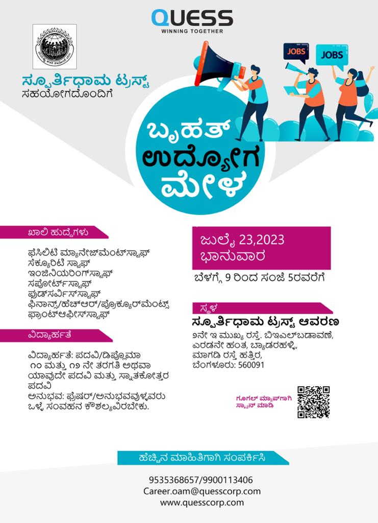 ಯುವಜನರಿಗೆ ಉದ್ಯೋಗಗಳನ್ನು ಕೊಡಿಸುವ ನಿಟ್ಟಿನಲ್ಲಿ QUESS ಸಂಸ್ಥೆಯು ಸ್ಫೂರ್ತಿಧಾಮ ಟ್ರಸ್ಟ್ ಸಹಯೋಗದಲ್ಲಿ ಜುಲೈ 23 ರಂದು ಬೃಹತ್ ಉದ್ಯೋಗ ಮೇಳ ಹಮ್ಮಿಕೊಳ್ಳಲಾಗಿದೆ ಎಂದು ಹೇಳಿಕೆಯಲ್ಲಿ ತಿಳಿಸಿದೆ.