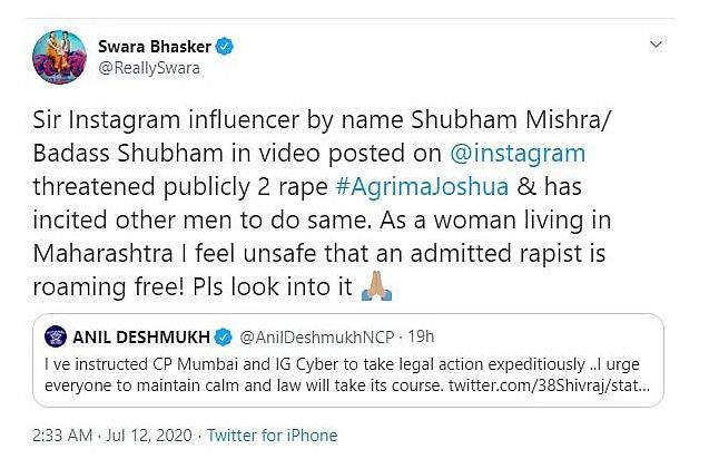 ಆದರೆ ಬೆದರಿಕೆಗಳು ನಿಂತಿಲ್ಲ ಎನ್ನಲಾಗಿದ್ದು, ಯೂಟ್ಯೂಬ್‌ನಲ್ಲಿ ಭಾರಿ ಅನುಯಾಯಿಗಳನ್ನು ಹೊಂದಿರುವ ಸಾಮಾಜಿಕ ಜಾಲತಾಣ ಬಳಕೆದಾರ ಶುಭಮ್ ಮಿಶ್ರಾ ಅಸಭ್ಯ ಭಾಷೆ ಬಳಸಿ ಮತ್ತು ಜೋಶುವಾ ವಿರುದ್ಧ ಅತ್ಯಾಚಾರ ಬೆದರಿಕೆ ಹಾಕುವ ವೀಡಿಯೊವನ್ನು ಪೋಸ್ಟ್ ಮಾಡಿದ್ದಾರೆ. ಜುಲೈ 12 ರ ಭಾನುವಾರ ವಡೋದರಾ ಪೊಲೀಸರು ಈ ವಿಷಯದಲ್ಲಿ ಸ್ವಯಂ ಪ್ರೇರಿತ ಕ್ರಮ ಕೈಗೊಂಡು, ಮಿಶ್ರಾ ಅವರನ್ನು ವಶಕ್ಕೆ ಪಡೆದಿದ್ದಾರೆ ಎಂದು ಹೇಳಿದರು. ಈ ವಿಷಯದಲ್ಲಿ ಶೀಘ್ರದಲ್ಲೇ ಎಫ್‌ಐಆರ್ ದಾಖಲಿಸುವ ಸಾಧ್ಯತೆ ಇದೆ.