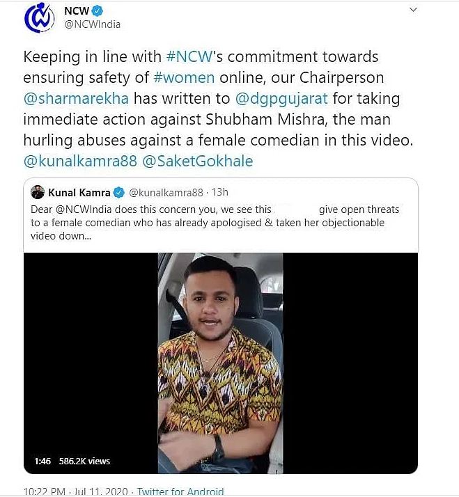ಅನೇಕ ಸ್ಟ್ಯಾಂಡ್-ಅಪ್ ಹಾಸ್ಯನಟರು ಮತ್ತು ಬಾಲಿವುಡ್ ನಟರು ವೀಡಿಯೊದ ಬಗ್ಗೆ ಕಳವಳ ವ್ಯಕ್ತಪಡಿಸಿದ ನಂತರ, ರಾಷ್ಟ್ರೀಯ ಮಹಿಳಾ ಆಯೋಗವು ಈ ವಿಷಯವನ್ನು ಗಣನೆಗೆ ತೆಗೆದುಕೊಂಡಿದೆ. ಮಿಶ್ರಾ ವಿರುದ್ಧ ತಕ್ಷಣ ಕ್ರಮ ಕೈಗೊಳ್ಳುವಂತೆ ಗುಜರಾತ್ ಪೊಲೀಸರನ್ನು ಕೋರಲಾಗಿದೆ ಎಂದು ಟ್ವಿಟ್ಟರ್ನಲ್ಲಿ ಬರೆದಿದೆ.