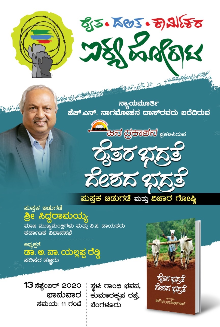 ಜನಪ್ರಕಾಶನ ಪ್ರಕಟಿಸುತ್ತಿರುವ ಕರ್ನಾಟಕ ಹೈಕೋರ್ಟ್‌ನ ವಿಶ್ರಾಂತ ನ್ಯಾಯಮೂರ್ತಿ ಹೆಚ್‌‌. ಎನ್‌. ನಾಗಮೋಹನ ದಾಸ್‌ ಅವರು ಬರೆದಿರುವ ’ರೈತರ ಭದ್ರತೆ ದೇಶದ ಭದ್ರತೆ’ ಪುಸ್ತಕ ಬಿಡುಗಡೆ ಹಾಗೂ ವಿಚಾರ ಗೋಷ್ಠಿ ಸೆಪ್ಟೆಂಬರ್‌ 13 ರ ಭಾನುವಾರ 11 ಗಂಟೆಗೆ ಬೆಂಗಳೂರಿನ ಕುಮಾರ ಕೃಪ ರಸ್ತೆಯ ಗಾಂಧಿ ಭವನದಲ್ಲಿ ನಡೆಯಲಿದೆ.