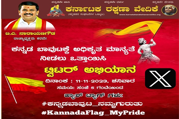 ಕನ್ನಡ ಬಾವುಟಕ್ಕೆ ಅಧಿಕೃತ ಮಾನ್ಯತೆ ನೀಡಬೇಕೆಂದು ಒತ್ತಾಯಿಸಿ ಕರ್ನಾಟಕ ರಕ್ಷಣಾ ವೇದಿಕೆ ಇದೇ ಶನಿವಾರ ಸಂಜೆ 5 ಗಂಟೆಯಿಂದ ಎಕ್ಸ್‌ನಲ್ಲಿ ಅಭಿಯಾನ ಹಮ್ಮಿಕೊಂಡಿದೆ.