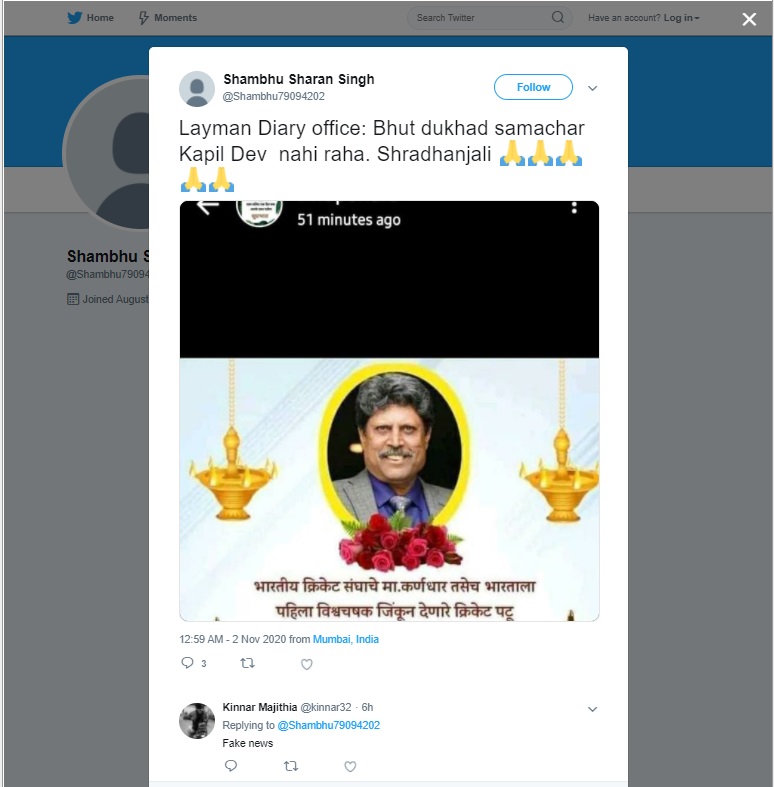 ಅಕ್ಟೋಬರ್ 23 ರಂದು ಹೃದಯಾಘಾತಕ್ಕೊಳಗಾಗಿ ದೆಹಲಿಯ ಖಾಸಗಿ ಆಸ್ಪತ್ರೆಗೆ ದಾಖಲಾಗಿದ್ದ ಭಾರತೀಯ ಕ್ರಿಕೆಟ್ ದಂತಕತೆ ಕಪಿಲ್ ದೇವ್ ಮೃತಪಟ್ಟಿದ್ದಾರೆ ಎಂಬ ಸುಳ್ಳುಸುದ್ದಿ ವೈರಲಾಗಿದ್ದು, ಸಾಮಾಜಿಕ ಜಾಲತಾಣದಲ್ಲಿ ಹಲವಾರು ಜನರು ಅವರಿಗೆ ಶ್ರದ್ದಾಂಜಲಿ ಅರ್ಪಿಸಿ ಪೋಸ್ಟರ್ ಹಂಚುತ್ತಿದ್ದಾರೆ.