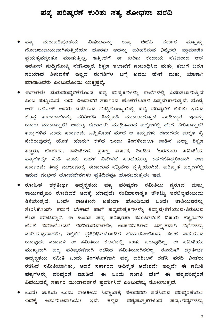 “ಇಷ್ಟು ದಿನ ಶಿಕ್ಷಣ ಸಚಿವರು ತಾವು ಮಾಡಿದ್ದೆಲ್ಲ ಸರಿ ಇದೆ ಎಂದು ಮಾತನಾಡುತ್ತಿದ್ದರು. ಆದರೆ ತಪ್ಪುಗಳಿರುವುದನ್ನು ಸರ್ಕಾರ ತನ್ನ ಆದೇಶದಲ್ಲಿ ಅಧಿಕೃತವಾಗಿ ಒಪ್ಪಿಕೊಂಡಿದೆ. ದುರಾದೃಷ್ಟವಶಾತ್‌ ಸರ್ಕಾರ ಕೇವಲ ಎಂಟು ಅಂಶಗಳನ್ನು ಮಾತ್ರ ಪ್ರಸ್ತಾಪಿಸಿ ನಿಜವಾದ ಸಮಸ್ಯೆಯನ್ನು ಮರೆಮಾಚಿದೆ. ಕರ್ನಾಟಕದ ಜನರ ಕಣ್ಣಿಗೆ ಮಣ್ಣೆರೆಚುವ ತಂತ್ರವಿದು. ನೂರಾರು ಗಂಭೀರ ಲೋಪಗಳನ್ನು ಗುರುತಿಸಿ ವರದಿ ಸಿದ್ಧಪಡಿಸಿದ್ದೇವೆ. ಪ್ರತಿ ಪಠ್ಯಪುಸ್ತಕದಲ್ಲೂ ಈ ತಪ್ಪುಗಳನ್ನು ಕಾಣಬಹುದು. ಅದ್ಯಾವುದರ ಬಗ್ಗೆಯೂ ಮಾತನಾಡದೆ ಕೇವಲ ಒಂದೆರಡು ತಪ್ಪುಗಳನ್ನು ಪ್ರಸ್ತಾಪಿಸಿ ಜನರನ್ನು ಯಾಮಾರಿಸಲಾಗುತ್ತಿದೆ. ತಮ್ಮ ಅಜೆಂಡಾವನ್ನೇ ಮುಂದುವರಿಸಲು ಹೊರಟಿದ್ದಾರೆ” ಎಂದು ಆಕ್ರೋಶ ವ್ಯಕ್ತಪಡಿಸಿದರು.