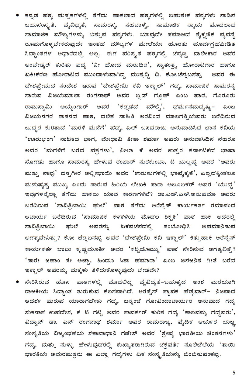 ಪಠ್ಯಪುಸ್ತಕದಲ್ಲಿ ಆಗಿರುವ ತಪ್ಪುಗಳ ಸಂಬಂಧ 62 ಪುಟಗಳ ಸಂಶೋಧನಾ ವರದಿ ಸಿದ್ಧಪಡಿಸಿರುವ ಸಂಶೋಧಕ, ಸಾಮಾಜಿಕ ಕಾರ್ಯರ್ತ ಹರ್ಷಕುಮಾರ್‌ ಕುಗ್ವೆಯವರು ‘ನಾನುಗೌರಿ.ಕಾಂ’ ಜೊತೆ ಮಾತನಾಡಿ, “ಸಂಪೂರ್ಣ ಪಠ್ಯಪುಸ್ತಕವನ್ನು ವಾಪಸ್‌ ಪಡೆದು ಹಳೆಯ ಪಠ್ಯಪುಸ್ತಕಗಳನ್ನೇ ಮಕ್ಕಳಿಗೆ ನೀಡುವುದು ಸರಿಯಾದ ಕ್ರಮ” ಎಂದು ಪ್ರತಿಪಾದಿಸಿದರು.