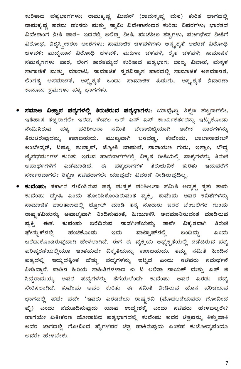 7) 7ನೇ ತರಗತಿ ಸಮಾಜ ವಿಜ್ಞಾನ ಭಾಗ-2 ರ ಪಠ್ಯಪುಸ್ತಕದ ‘ಕರ್ನಾಟಕ ರಾಜ್ಯ ಏಕೀಕರಣ ಹಾಗೂ ಗಡಿವಿವಾದಗಳು’ ಎಂಬ ಪಾಠದಲ್ಲಿ ರಾಷ್ಟ್ರಕವಿ ಕುವೆಂಪು ರವರ ಹಾಗೂ ಹುಯಿಲಗೋಳ ನಾರಾಯಣರಾವ್ ರವರ ಭಾವಚಿತ್ರಗಳನ್ನು ಅಳವಡಿಸುವುದು.
