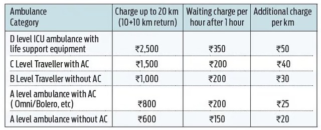 ಕೇರಳ ಸಾರಿಗೆ ಇಲಾಖೆಯು ರಾಜ್ಯದಾದ್ಯಂತ ಆಂಬ್ಯುಲೆನ್ಸ್‌ಗಳಿಗೆ ಪ್ರಮಾಣಿತ ಸುಂಕ ಮತ್ತು ದರಗಳನ್ನು ತಂದಿದ್ದು, ಮಿತಿಮೀರಿದ ಶುಲ್ಕಕ್ಕೆ ಸಂಬಂಧಿಸಿದ ಸಮಸ್ಯೆಗಳನ್ನು ಪರಿಹರಿಸುವ ಪ್ರಯತ್ನ ಮಾಡಿದೆ. ಐದು ವರ್ಗದ ಆಂಬ್ಯುಲೆನ್ಸ್‌ಗಳಿಗೆ ಕನಿಷ್ಠ 20 ಕಿ.ಮೀ (ರಿಟರ್ನ್ ದೂರವನ್ನು ಒಳಗೊಂಡಂತೆ) ದರವನ್ನು ನಿಗದಿಪಡಿಸಲಾಗಿದೆ. ಈ ವರ್ಗಗಳಲ್ಲಿ ಮೂಲ ದರವು 600 ರೂ. ಗಳಿಂದ 2,500 ರೂ.ಗಳ ವರೆಗೆ ಇರುತ್ತದೆ.