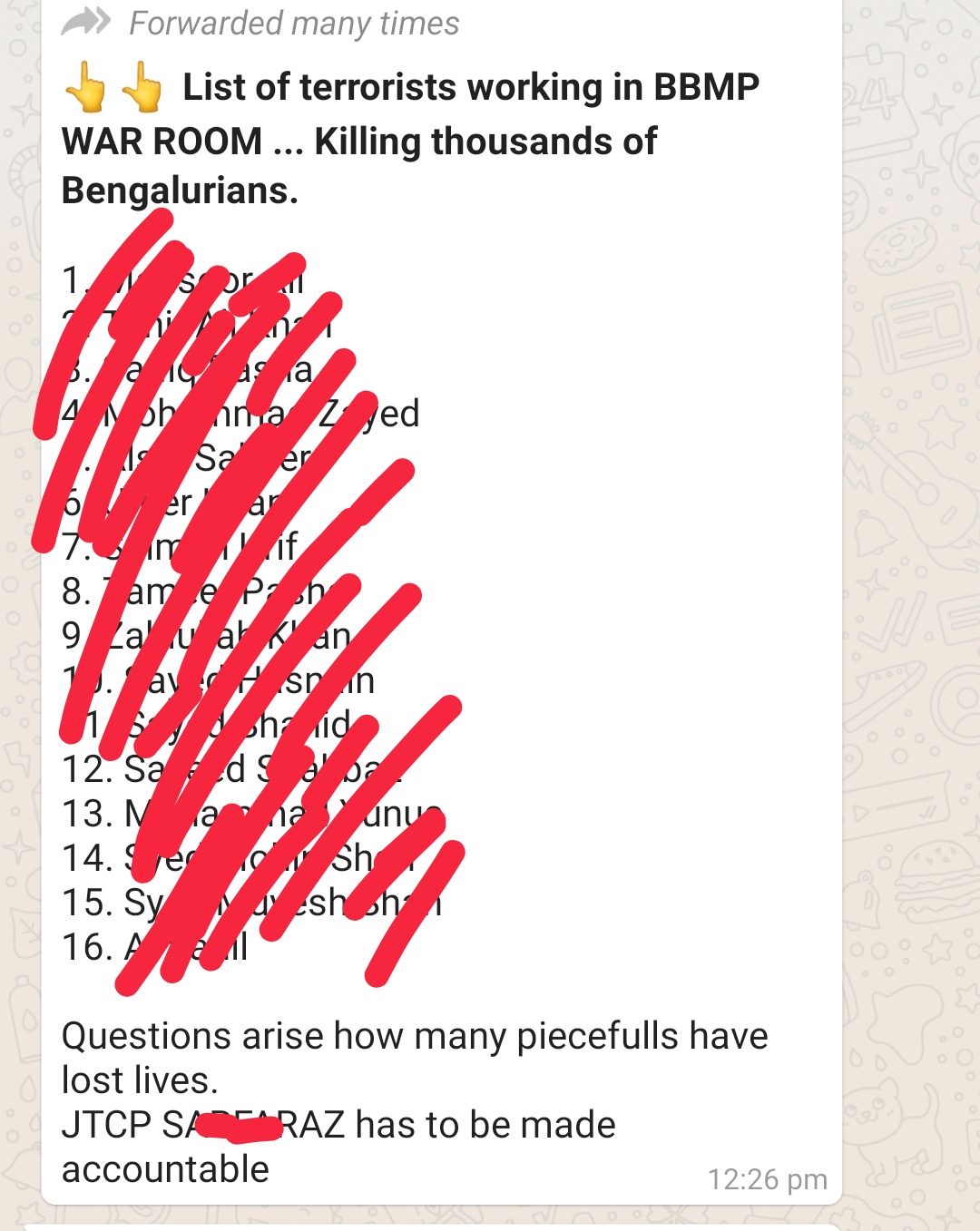 ಇದು ಬೇರೆ ಸಮಯದಲ್ಲಾದರೇ ಲಿಂಚಿಂಗ್-ಗಲಭೆಗಳಿಗೆ ಕಾರಣವಾಗುತ್ತಿತ್ತೇನೋ. ಆತ ಪಟ್ಟಿ ಓದಿ ಮುಗಿಸುವಷ್ಟ್ಟರಲ್ಲೆ 16 ಜನರ ಆ ಮುಗ್ಧ ಕೆಲಸಗಾರರ ಹೆಸರುಗಳನ್ನು ಭಯೋತ್ಪಾದಕರು ಎಂದು ಬಿಂಬಿಸುವ ವಾಟ್ಸ್ಆಪ್ ಮೆಸೇಜ್ಗಳನ್ನು ’ಎಲೀಟ್’ ಜನರು ಹಬ್ಬಲು ಪ್ರಾರಂಭಿಸಿದ್ದರು. ಅಂದರೆ ಈ ಕೆಲಸದಲ್ಲಿ ಬಿಜೆಪಿ ಐಟಿ ಸೆಲ್ ಕೂಡ ಭಾಗಿಯಾಗಿ, ಇದು ಪೂರ್ವನಿಯೋಜಿತವಾದ ಕೆಲಸವಾಗಿತ್ತು ಎಂದು ಮೇಲ್ನೋಟಕ್ಕೇ ತಿಳಿಯುತ್ತದೆ.