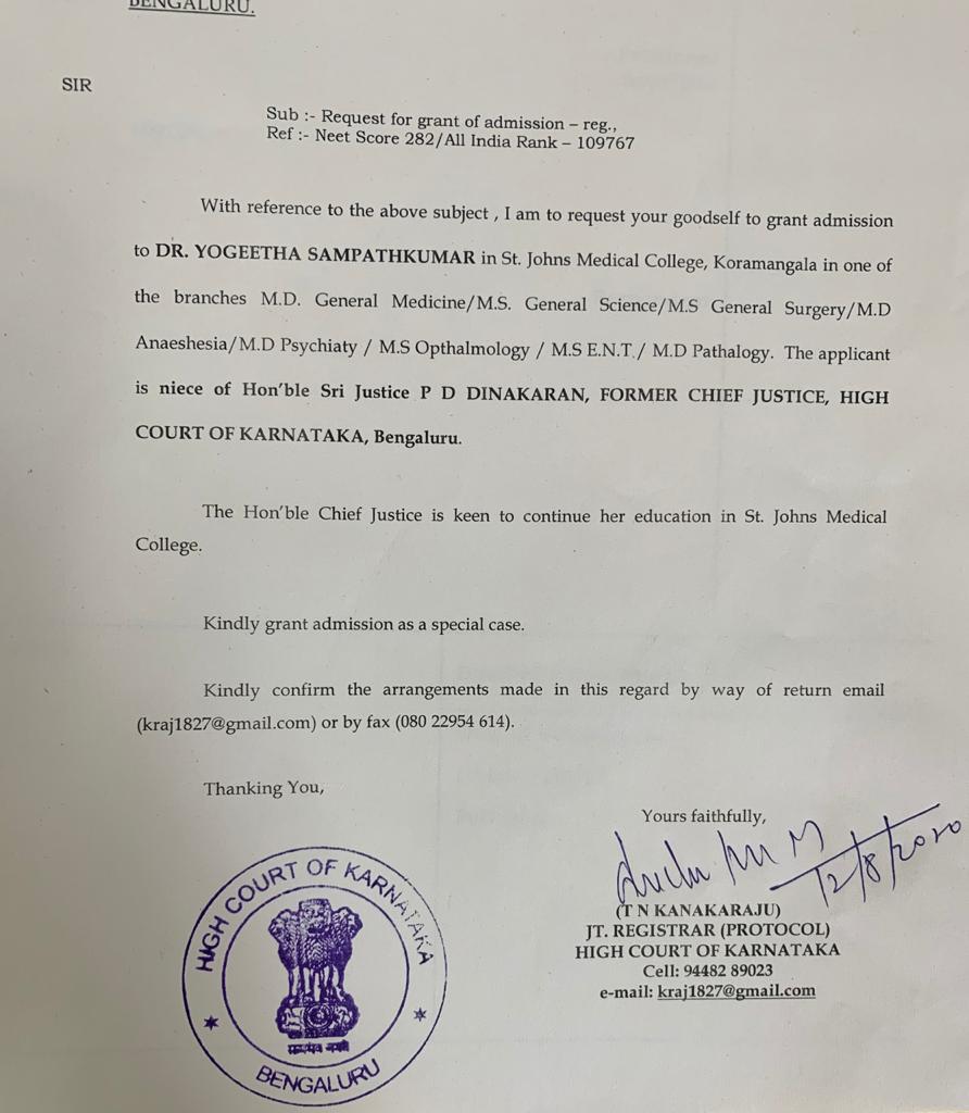 ಕರ್ನಾಟಕ ಹೈಕೋರ್ಟ್‌ನ ಜಂಟಿ ರಿಜಿಸ್ಟ್ರಾರ್‌ ಟಿ.ಎನ್ ಕನಕರಾಜುರವರು ಬೆಂಗಳೂರಿನ ಸೇಂಟ್ ಜಾನ್‌ ಮೆಡಿಕಲ್ ಕಾಲೇಜಿಗೆ ಶಿಫಾರಸ್ಸು ಪತ್ರ ಬರೆದಿದ್ದು, ಮಾಜಿ ಮುಖ್ಯ ನ್ಯಾಯಾಧೀಶರ ಸಂಬಂಧಿಯೊಬ್ಬರು ನೀಟ್‌ ಪರೀಕ್ಷೆಯಲ್ಲಿ ಅಖಿಲ ಭಾರತ 1,09,767ನೇ ರ್ಯಾಂಕ್ ಪಡೆದಿದ್ದು, ಅವರಿಗೆ ತಮ್ಮ ಕಾಲೇಜಿನಲ್ಲಿ ಪ್ರವೇಶ ನೀಡುವಂತೆ ಕೋರಲಾಗಿದೆ.