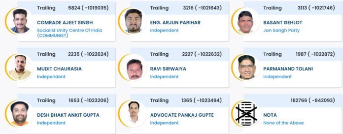ಇಸಿಐ ಅಂಕಿಅಂಶಗಳ ಪ್ರಕಾರ ಬಿಜೆಪಿಯ ಹಾಲಿ ಸಂಸದ ಶಂಕರ್ ಲಾಲ್ವಾನಿ 1010694 ಮತಗಳನ್ನು ಗಳಿಸಿದ್ದಾರೆ. ಈ ಮೂಲಕ ಲಾಲ್ವಾನಿ 829611 ಮತಗಳಿಂದ ಭಾರಿ ಮುನ್ನಡೆಯಲ್ಲಿದ್ದಾರೆ.