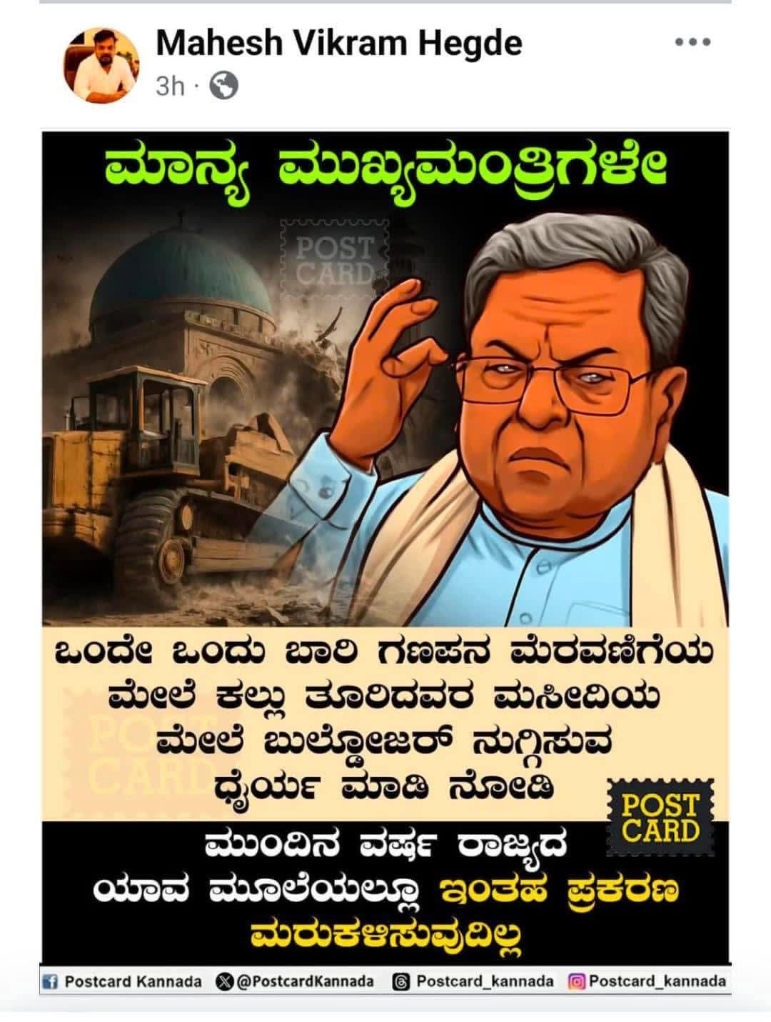 ಮುಖ್ಯಮಂತ್ರಿ ಸಿದ್ದರಾಮಯ್ಯ ಅವರ ಫೋಟೊ ಎಡಿಟ್ ಮಾಡಿ ಮುಖ್ಯಮಂತ್ರಿಗಳೇ, “ಗಣಪನ ಮೆರವಣಿಗೆಯ ಮೇಲೆ ಕಲ್ಲು ತೂರಿದವರ ಮಸೀದಿ ಮೇಲೆ ಬುಲ್ಡೋಜರ್ ನುಗ್ಗಿಸಿ ” ಎಂದು ಬರೆಯಲಾದ ಪೋಸ್ಟರ್ ಅನ್ನು ಮಹೇಶ್ ವಿಕ್ರಂ ಹೆಗ್ಡೆ ಸಾಮಾಜಿಕ ಜಾಲತಾಣಗಳಲ್ಲಿ ಪೋಸ್ಟ್ ಮಾಡಿದ್ದರು.