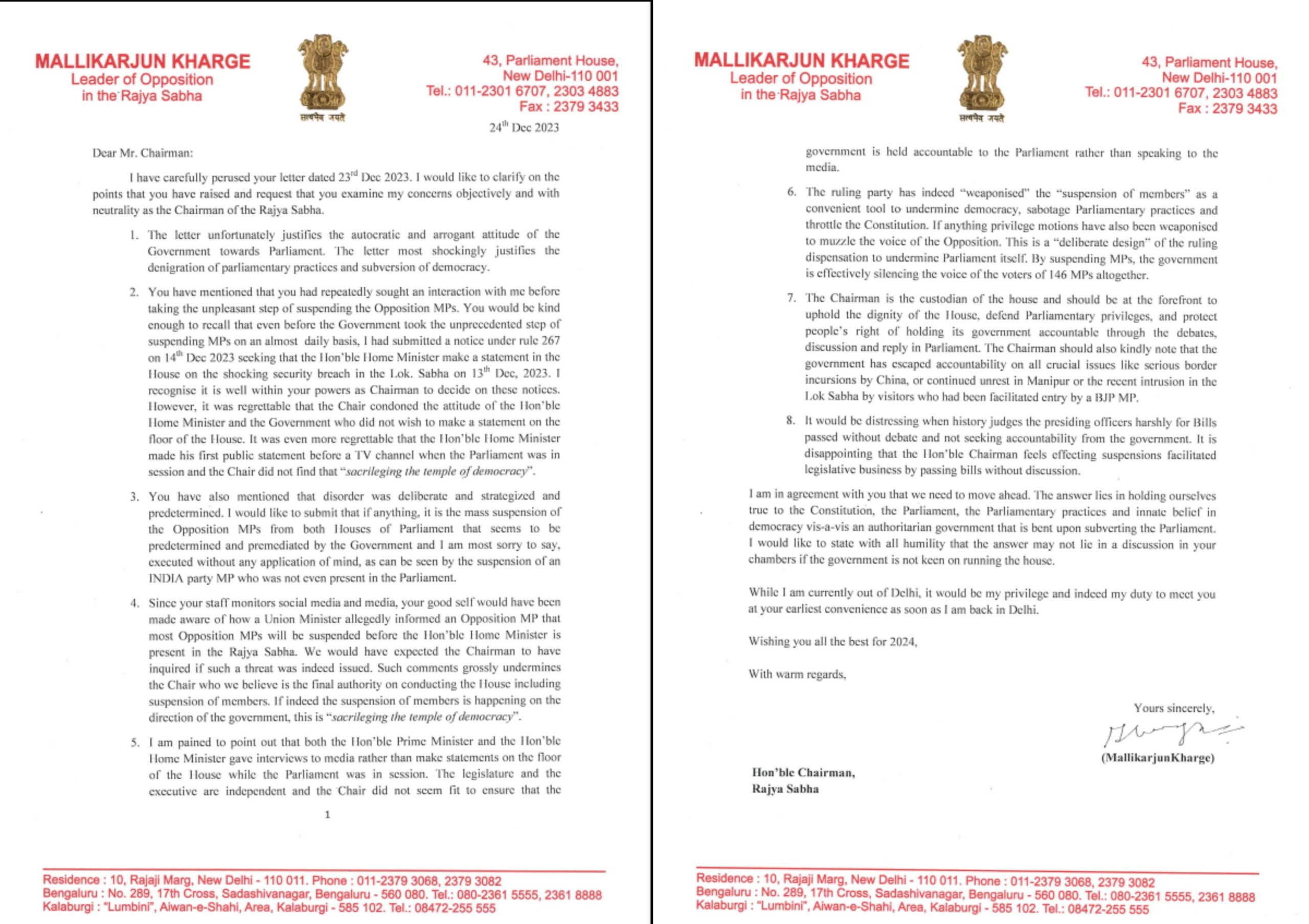ಲೋಕಸಭೆ ಭದ್ರತೆ ಉಲ್ಲಂಘನೆಯ ಗದ್ದಲದಲ್ಲೆ ಸಂಸತ್ತಿನ ಚಳಿಗಾಲದ ಅಧಿವೇಶನ ಮುಗಿದ ಒಂದು ದಿನದ ನಂತರ, ಕಾಂಗ್ರೆಸ್ ಅಧ್ಯಕ್ಷ ಮತ್ತು ರಾಜ್ಯಸಭಾ ಸಂಸದ ಮಲ್ಲಿಕಾರ್ಜುನ ಖರ್ಗೆ ಅವರು ಉಪರಾಷ್ಟ್ರಪತಿ ಜಗದೀಪ್ ಧನ್ಖರ್ ಅವರಿಗೆ ಪತ್ರ ಬರೆದು, ‘ಇಷ್ಟು ದೊಡ್ಡ ಪ್ರಮಾಣದಲ್ಲಿ ಸಂಸದರನ್ನು ಅಮಾನತುಗೊಳಿಸಿರುವುದು ನಮ್ಮ ಸಂಸದೀಯ ಪ್ರಜಾಪ್ರಭುತ್ವದ ಮೂಲ ತತ್ವಗಳಿಗೆ ಹಾನಿಕಾರಕ. ರಚನಾತ್ಮಕವಾಗಿ ಸಮಸ್ಯೆಗಳನ್ನು ಪರಿಹರಿಸಲು ಉಪಾಧ್ಯಕ್ಷರನ್ನು ಭೇಟಿ ಮಾಡಲು ಸಿದ್ಧ’ ಎಂದು ಹೇಳಿದ್ದಾರೆ.