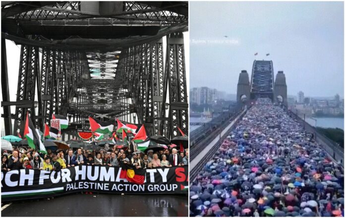 ಆಸ್ಟ್ರೇಲಿಯಾದ ಸಿಡ್ನಿ ನಗರದಲ್ಲಿ ಭಾನುವಾರ (ಆ.3) ಪ್ಯಾಲೆಸ್ತೀನ್ ಪರ ಅಥವಾ ಗಾಝಾ ಜನತೆಯ ಪರ ಬೃಹತ್ ಪ್ರತಿಭಟನೆ ನಡೆಯಿತು. ಲಕ್ಷಾಂತರ ಜನರು ಐತಿಹಾಸಿಕ ಹಾರ್ಬರ್ ಬ್ರಿಡ್ಜ್ ಮೇಲೆ ರ್ಯಾಲಿ ನಡೆಸಿದರು.