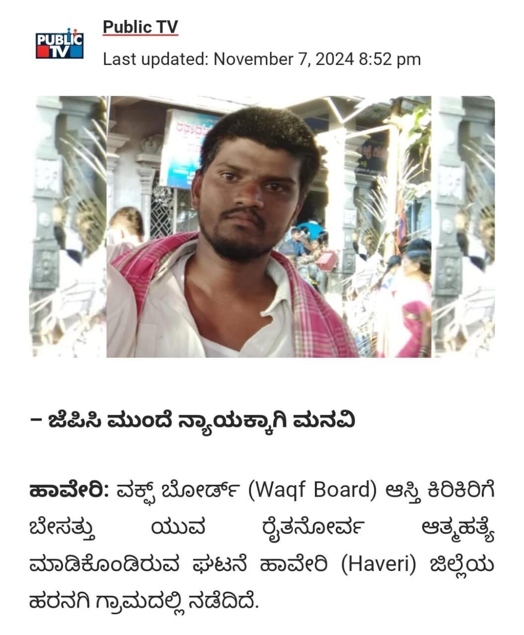 ಕನ್ನಡ ಸುದ್ದಿ ವೆಬ್ಸೈಟ್ಗಳಾದ ‘ಕನ್ನಡ ನ್ಯೂಸ್ ನೌ, ಕನ್ನಡ ದುನಿಯಾ, ಪಬ್ಲಿಕ್ ಟಿವಿ‘ ಸೇರಿದಂತೆ ಕೆಲ ಮಾಧ್ಯಮಗಳು ‘ಜಮೀನಿನ ಪಹಣಿಯಲ್ಲಿ ‘ವಕ್ಫ್’ ಹೆಸರು ನಮೂದು, ಹಾವೇರಿಯಲ್ಲಿ ಮನನೊಂದು ರೈತ ಆತ್ಮಹತ್ಯೆ’ ಎಂಬ ಶೀರ್ಷಿಕೆಗಳಲ್ಲಿ ಸುಳ್ಳು ಸುದ್ದಿ ಪ್ರಕಟಿಸಿತ್ತು.