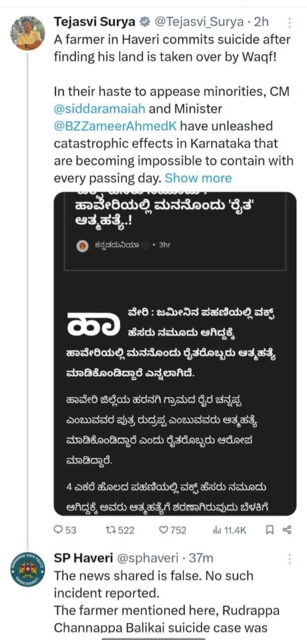 ಈ ಪೈಕಿ ಕನ್ನಡ ದುನಿಯಾ ಪ್ರಕಟಿಸಿದ್ದ ಸುದ್ದಿಯ ಸ್ಕ್ರೀನ್ ಶಾಟ್ ಅನ್ನು ಎಕ್ಸ್ನಲ್ಲಿ ಹಂಚಿಕೊಂಡಿದ್ದ ಸಂಸದ ತೇಜಸ್ವಿ ಸೂರ್ಯ,”ತನ್ನ ಭೂಮಿಯನ್ನು ವಕ್ಫ್ ಕಬಳಿಸಿದೆ ಎಂದು ಗೊತ್ತಾಗಿ ಹಾವೇರಿಯಲ್ಲಿ ರೈತರೊಬ್ಬರು ಆತ್ಮಹತ್ಯೆ ಮಾಡಿಕೊಂಡಿದ್ದಾರೆ. ಸಿಎಂ ಸಿದ್ದರಾಮಯ್ಯ ಮತ್ತು ಸಚಿವ ಝಮೀರ್ ಅಹ್ಮದ್ ಅವರ ಅಲ್ಪಸಂಖ್ಯಾತರನ್ನು ಓಲೈಸುವ ತರಾತುರಿಯಿಂದ ಕರ್ನಾಟಕ ಪ್ರತಿದಿನ ದುರಂತ ಪರಿಣಾಮಗಳನ್ನು ಎದುರಿಸುತ್ತಿದೆ” ಎಂದು ಬರೆದುಕೊಂಡಿದ್ದರು. ಪ್ರಸ್ತುತ ಈ ಪೋಸ್ಟ್ ಅನ್ನು ತೇಜಸ್ವಿ ಸೂರ್ಯ ಡಿಲಿಟ್ ಮಾಡಿದ್ದಾರೆ.