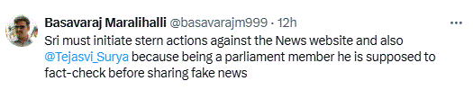 ಪೊಲೀಸರ ಈ ಪ್ರಕಟಣೆಯಿಂದ ಸಂಸದ ತೇಜಸ್ವಿ ಸೂರ್ಯ ಸುಳ್ಳು ಸುದ್ದಿ ಹಂಚಿಕೊಂಡಿರುವುದು ಖಚಿತವಾಗಿದೆ. ಹಾಗಾಗಿ, ಅವರ ವಿರುದ್ದ ಕ್ರಮ ಕೈಗೊಳ್ಳುವಂತೆ ಸಾರ್ವಜನಿಕರು ಸಾಮಾಜಿಕ ಜಾಲತಾಣಗಳಲ್ಲಿ ಒತ್ತಾಯಿಸಿದ್ದಾರೆ.