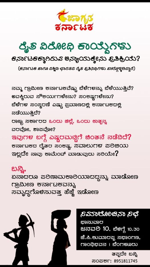 ‘ರೈತ ವಿರೋಧಿ ಕಾಯ್ದೆಗಳು ಮತ್ತು ಕರ್ನಾಟಕಕ್ಕಾಗಿರುವ ಅನ್ಯಾಯಕ್ಕೇನು ಪ್ರತಿಕ್ರಿಯೆ?’ ಎಂಬ ವಿಷಯದ ಕುರಿತು ರಾಜ್ಯದ ಹಾಗೂ ದಕ್ಷಿಣ ಭಾರತದ ರೈತ ಪ್ರತಿನಿಧಿಗಳ ಸಮಾಲೋಚನಾ ಸಭೆಯನ್ನು ‘ಜಾಗೃತ ಕರ್ನಾಟಕ’ ಸಂಘಟನೆ ಆಯೋಜಿಸಿದೆ. ಸಭೆಯು ಜನವರಿ 10 ರ ಭಾನುವಾರ ಬೆಳಿಗ್ಗೆ 10:30ಕ್ಕೆ ಬೆಂಗಳೂರಿನ ಗಾಂಧಿ ಭವನದ ಜೆ.ಸಿ. ಕುಮಾರಪ್ಪ ಸಭಾಂಗಣದಲ್ಲಿ ನಡೆಯಲಿದೆ.