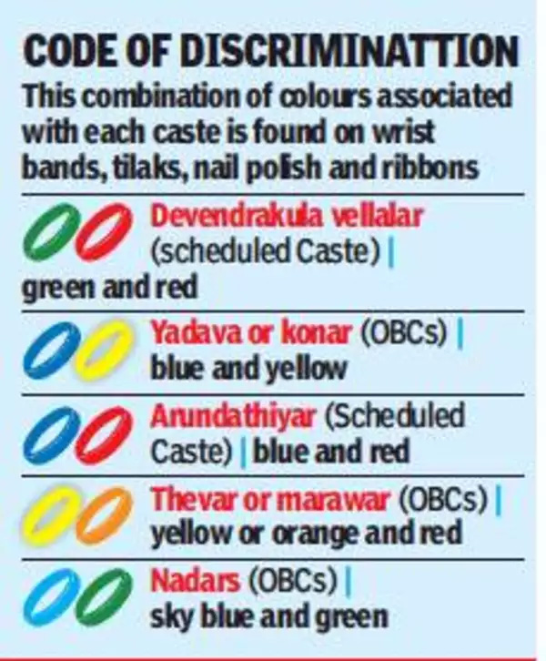 ಒಬಿಸಿ ವರ್ಗಕ್ಕೆ ಸೇರಿದ ನಾದರ್ ಸಮುದಾಯದವರು ಹಸಿರು ಮತ್ತು ನೀಲಿ ಬಣ್ಣದ ಬ್ಯಾಂಡ್‌ಗಳನ್ನು, ಥೇವರ್ ಮತ್ತು ಮಾರವರ್ ಸಮುದಾಯದವರು ಹಳದಿ ಮತ್ತು ಕಿತ್ತಳೆ ಬಣ್ಣದ, ಯಾದವ ಮತ್ತು ಕೊಣಾರ್ ಸಮುದಾಯದವರು ಹಳದಿ ಮತ್ತು ನೀಲಿ ಬಣ್ಣದ ಬ್ಯಾಂಡ್‌ಗಳನ್ನು ಧರಿಸುತ್ತಾರೆ. ಪರಿಶಿಷ್ಟ ಜಾತಿಯ ಅರುಂಧತಿಯಾರ್ ಸಮುದಾಯದವರು ಕೆಂಪು ಮತ್ತು ನೀಲಿ ಬಣ್ಣದ, ದೇವೇಂದ್ರಕುಲ ವೆಲ್ಲಲಾರ್ ಸಮುದಾಯದವರು ಕೆಂಪು ಮತ್ತು ಹಸಿರು ಬಣ್ಣದ ರಿಸ್ಟ್ ಬ್ಯಾಂಡ್‌ಗಳನ್ನು ಧರಿಸುತ್ತಾರೆ ಎಂದು ಟೈಮ್ಸ್ ಆಫ್ ಇಂಡಿಯಾ ವರದಿ ಮಾಡಿದೆ.
