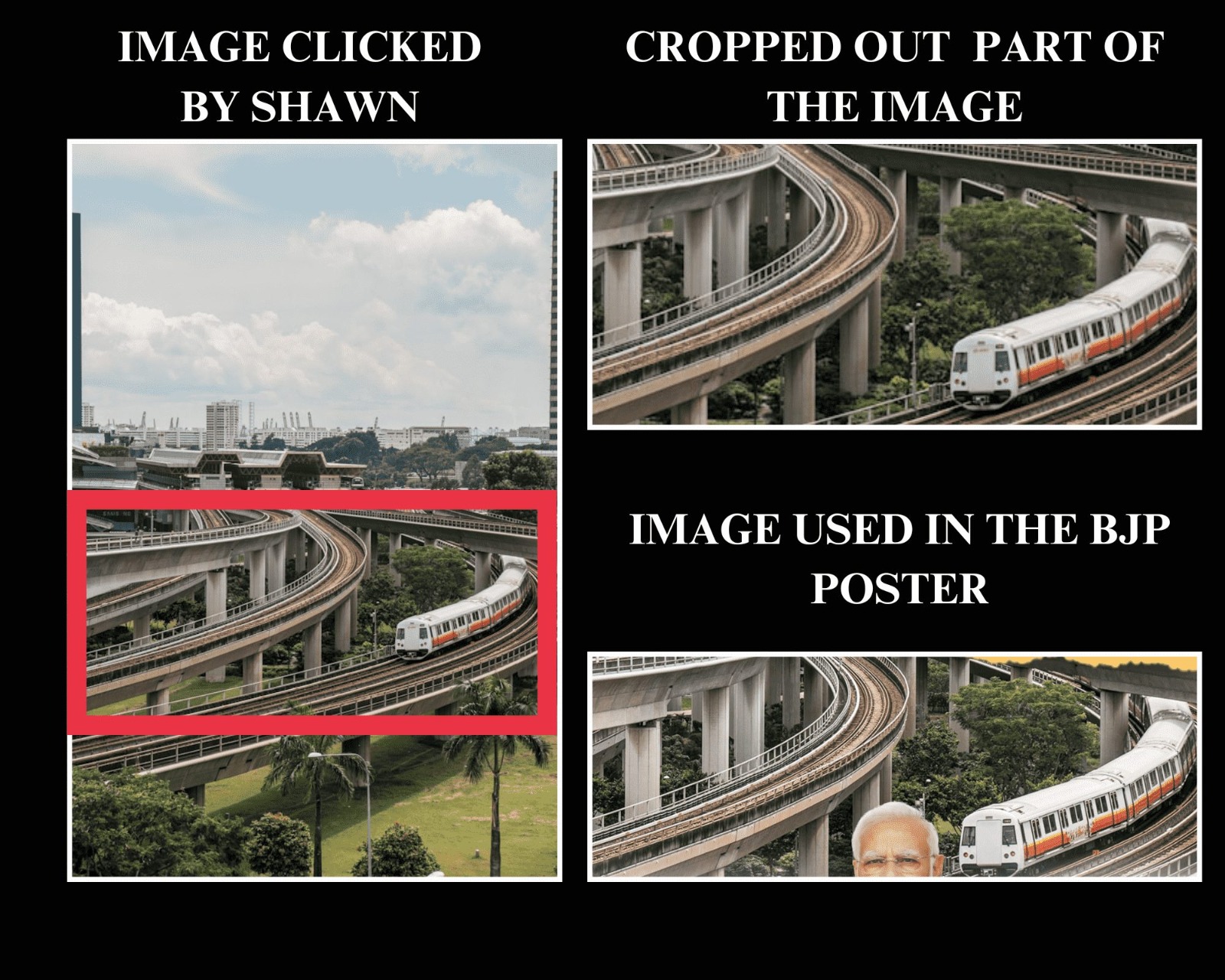 ಶಾನ್ ಅವರು ಸೆರೆ ಹಿಡಿದ ಸಿಂಗಾಪುರದ ಮೆಟ್ರೋ ನಿಲ್ದಾಣದ ಫೋಟೋವನ್ನು ಕ್ರಾಪ್ ಮಾಡಿ ಬಿಜೆಪಿ ತನ್ನ ಪೋಸ್ಟರ್ಗೆ ಬಳಸಿಕೊಂಡಿದೆ ಎಂಬುವುದನ್ನು ಆಲ್ಟ್ ನ್ಯೂಸ್ ಸ್ಪಷ್ಟವಾಗಿ ಹೋಲಿಕೆ ಮಾಡಿ ತೋರಿಸಿದೆ.