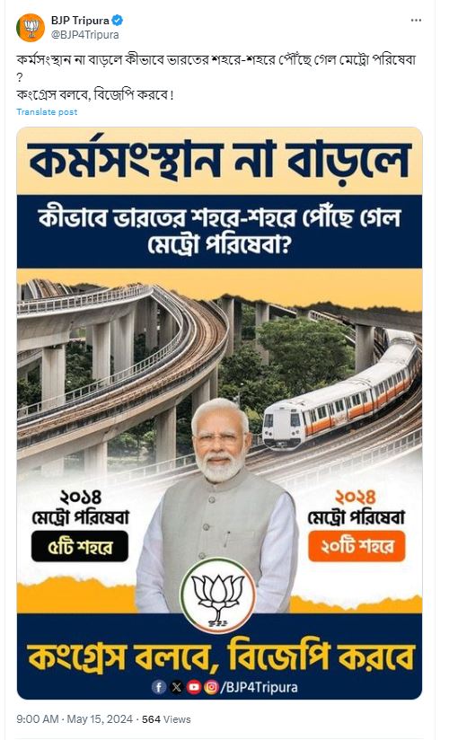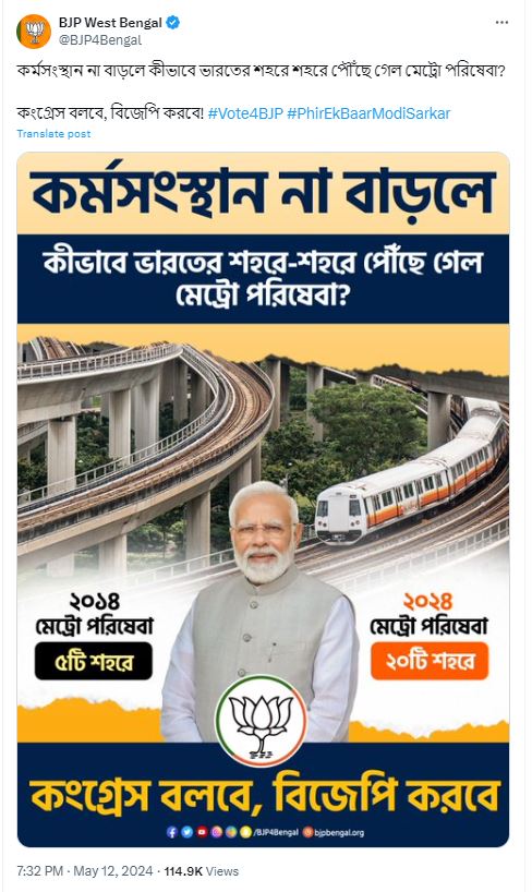 ಪ್ರಧಾನಿ ನರೇಂದ್ರ ಮೋದಿಯವರ ಫೋಟೋ ಮತ್ತು ಹಿಂಭಾಗದಲ್ಲಿ ಮೆಟ್ರೋ ರೈಲು ಸಾಗುತ್ತಿರು ಚಿತ್ರವಿರುವ ಈ ಪೋಸ್ಟರ್ ಜೊತೆಗೆ “ಉದ್ಯೋಗ ಸೃಷ್ಟಿಯಾಗುತ್ತಿಲ್ಲವಾದರೆ, ಮೆಟ್ರೋ ಸೇವೆಗಳು ಭಾರತದ ವಿವಿಧ ನಗರಗಳನ್ನು ತಲುಪಿದ್ದು ಹೇಗೆ? 2014 ರಲ್ಲಿ 5 ನಗರಗಳಲ್ಲಿ ಇದ್ದ ಮೆಟ್ರೋ ಸೇವೆಗಳು ಈಗ 20 ನಗರಗಳಿಗೆ ವಿಸ್ತರಿಸಿವೆ” ಎಂದು ಬರೆದುಕೊಳ್ಳಲಾಗಿತ್ತು.