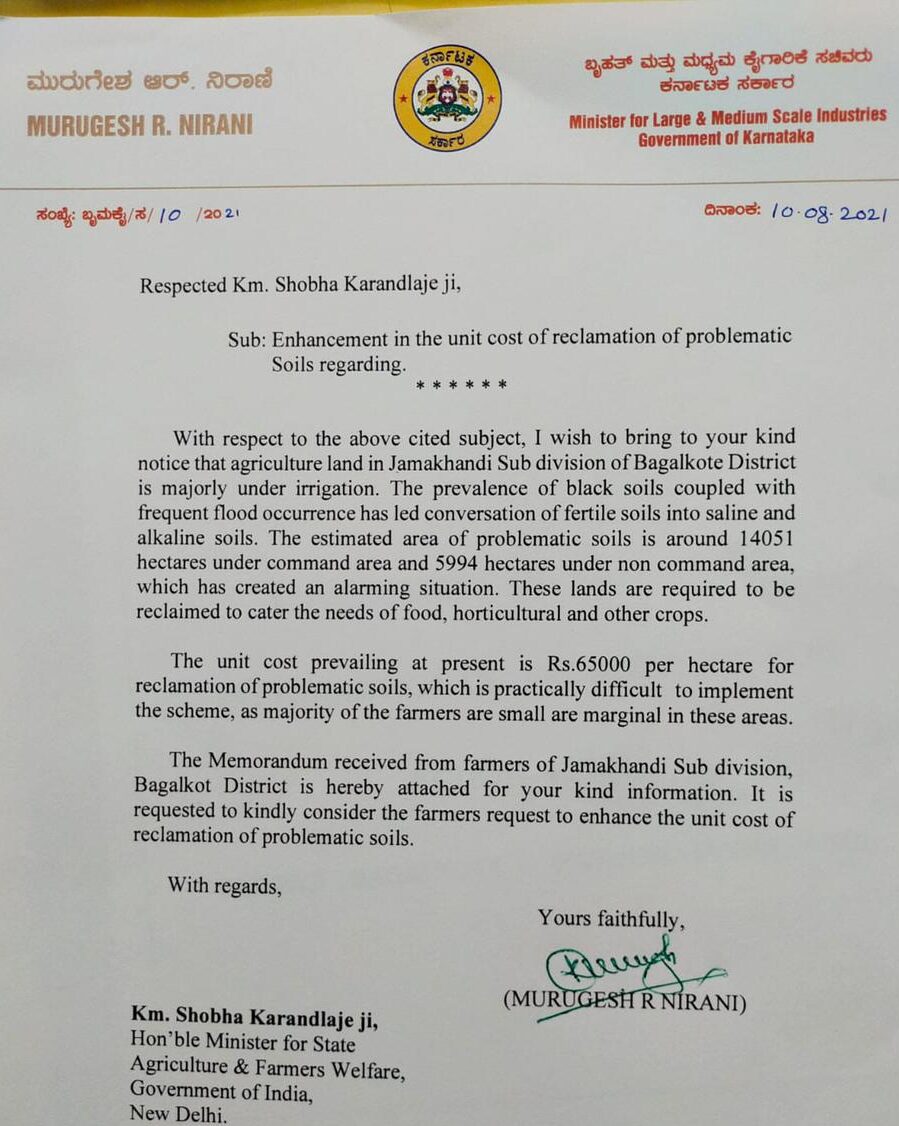 ನವದೆಹಲಿಯಲ್ಲಿ ಕೇಂದ್ರ ಕೃಷಿ ಮತ್ತು ರೈತ ಕಲ್ಯಾಣ ಸಚಿವೆ ಶೋಭಾ ಕರದ್ಲಾಂಜೆ ಅವರನ್ನು ಭೇಟಿಯಾದ ಬೃಹತ್ ಮತ್ತು ಮಧ್ಯಮ ಕೈಗಾರಿಕಾ ಸಚಿವ ನಿರಾಣಿ ಅವರು ತಕ್ಷಣವೇ ಪರಿಹಾರದ ಮೊತ್ತವನ್ನು ಹೆಚ್ಚಿಸಲು ಅಗತ್ಯವಾದ ಕ್ರಮಗಳನ್ನು ತೆಗೆದುಕೊಳ್ಳಬೇಕೆಂದು ಮನವಿ ಪತ್ರ ಸಲ್ಲಿಸಿದ್ದಾರೆ.