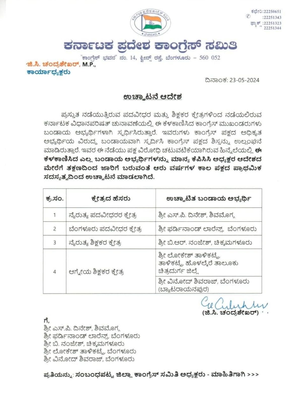 ನೈರುತ್ಯ ಪದವೀಧರ ಕ್ಷೇತ್ರದ ಬಂಡಾಯ ಅಭ್ಯರ್ಥಿಯಾದ ಶಿವಮೊಗ್ಗದ ಎಸ್.ಪಿ ದಿನೇಶ್, ಬೆಂಗಳೂರು ಪದವೀಧರ ಕ್ಷೇತ್ರದ ಬಂಡಾಯ ಅಭ್ಯರ್ಥಿ ಬೆಂಗಳೂರಿನ ಫರ್ಡಿನಾಂಡ್ ಲಾರೆನ್ಸ್, ನೈರುತ್ಯ ಶಿಕ್ಷಕರ ಕ್ಷೇತ್ರದ ಬಂಡಾಯ ಅಭ್ಯರ್ಥಿ ಚಿಕ್ಕಮಗಳೂರಿನ ಬಿ.ಆರ್. ನಂಜೇಶ್ ಮತ್ತು ಆಗ್ನೇಯ ಶಿಕ್ಷಕರ ಕ್ಷೇತ್ರದ ಬಂಡಾಯ ಅಭ್ಯರ್ಥಿಗಳಾದ ಚಿತ್ರದುರ್ಗ ಜಿಲ್ಲೆ ಹೊಳಲ್ಕೆರೆ ತಾಲೂಕಿನ ತಾಳಿಕಟ್ಟೆಯ ಲೋಕೇಶ್ ಮತ್ತು ಬೆಂಗಳೂರಿನ ಬ್ಯಾಟರಾಯನಪುರದ ವಿನೋದ್ ಶಿವರಾಜ್ ಅವರನ್ನು ಆರು ವರ್ಷಗಳ ಕಾಲ ಪಕ್ಷದ ಪ್ರಾಥಮಿಕ ಸದಸ್ಯತ್ವದಿಂದ ಉಚ್ಚಾಟನೆ ಮಾಡಿ ಕೆಪಿಸಿಸಿ ಕಾರ್ಯಾಧ್ಯಕ್ಷ ಜಿಸಿ ಚಂದ್ರಶೇಖರ್ ಆದೇಶ ಹೊರಡಿಸಿದ್ದಾರೆ.