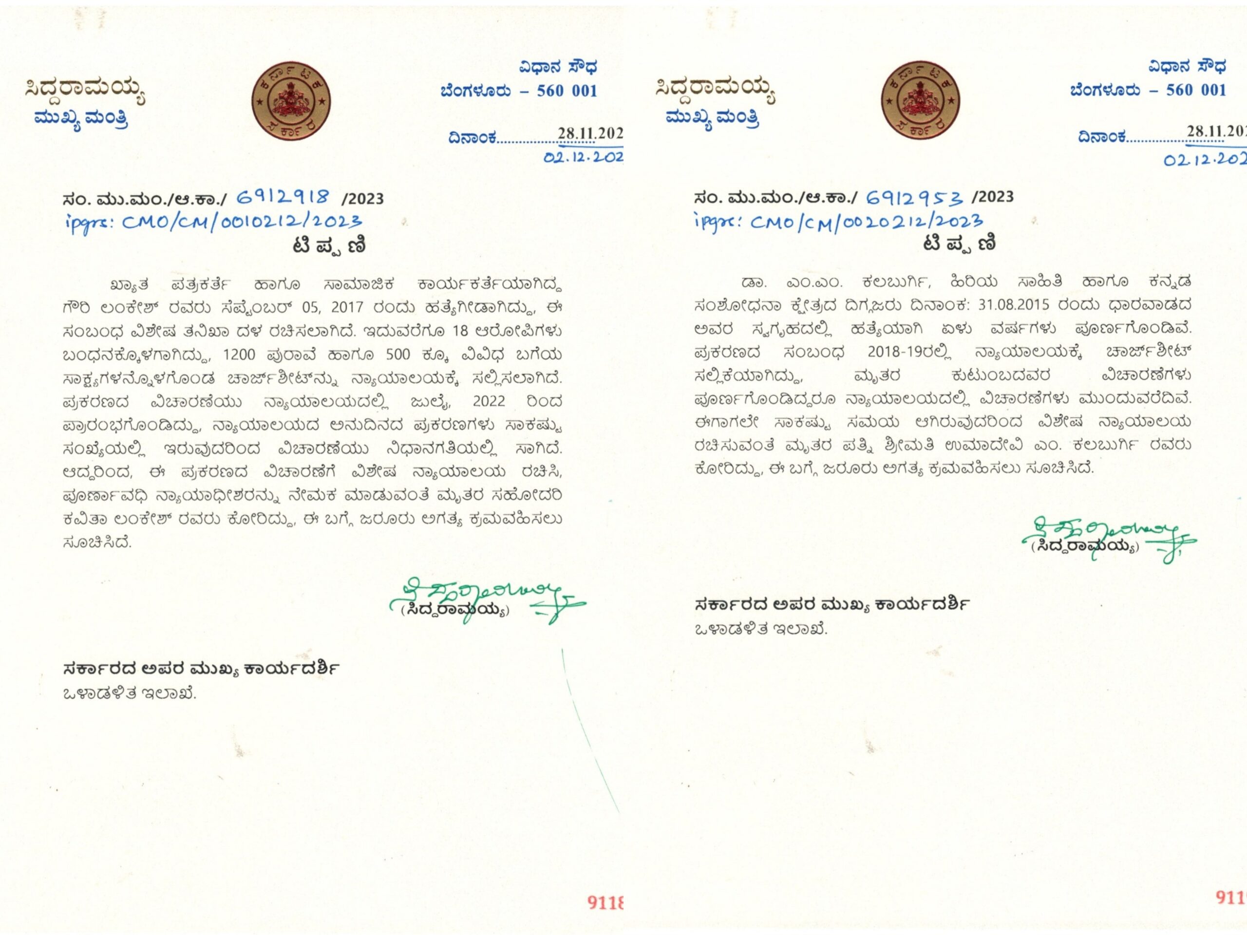 ಖ್ಯಾತ ಸಂಶೋಧಕ ಎಂ.ಎಂ. ಕಲ್ಬುರ್ಗಿ ಮತ್ತು ಜನಪರ ಪತ್ರಕರ್ತೆ ಗೌರಿ ಲಂಕೇಶ್ ಅವರ ಹತ್ಯೆ ಪ್ರಕರಣಗಳ ತ್ವರಿತ ವಿಚಾರಣೆಗೆ ವಿಶೇಷ ನ್ಯಾಯಾಲಯ ಸ್ಥಾಪನೆ ಹಾಗೂ ಪೂರ್ಣಾವಧಿ ನ್ಯಾಯಾಧೀಶರ ನೇಮಕಾತಿ ಮಾಡುವಂತೆ ಸಲ್ಲಿಸಿದ್ದ ಮನವಿಗೆ ರಾಜ್ಯ ಸರ್ಕಾರ ಸ್ಪಂದಿಸಿದ್ದು, ಈ ಬಗ್ಗೆ ತ್ವರಿತವಾಗಿ ಅಗತ್ಯ ಕ್ರಮ ವಹಿಸುವಂತೆ ಒಳಾಡಳಿತ ಇಲಾಖೆಯ ಅಪರ ಮುಖ್ಯ ಕಾರ್ಯದರ್ಶಿಗಳಿಗೆ ಮುಖ್ಯಮಂತ್ರಿ ಸಿದ್ದರಾಮಯ್ಯ ಪತ್ರ ಬರೆದಿದ್ದಾರೆ.