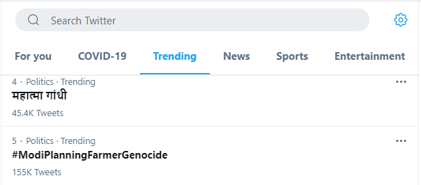 ಇದರ ಭಾಗವಾಗಿ ಟ್ವಿಟರ್ನಲ್ಲಿ #ModiPlanningFarmerGenocide (ರೈತರ ನರಮೇಧ ನಡೆಸಲು ಯೋಜಿಸುತ್ತಿರುವ ಮೋದಿ) ಎಂದು ಆಕ್ರೋಶ ಭುಗಿಲೆದ್ದಿದೆ. ಈ ವರದಿ ಬರೆಯುವ ವೇಳೆಗೆ ಈ ಹ್ಯಾಶ್ಟ್ಯಾಗ್ ಬಳಸಿ ಸುಮಾರು 1.5 ಲಕ್ಷಕ್ಕೂ ಹೆಚ್ಚು ಜನ ಟ್ವೀಟ್ ಮಾಡಿದ್ದರು.