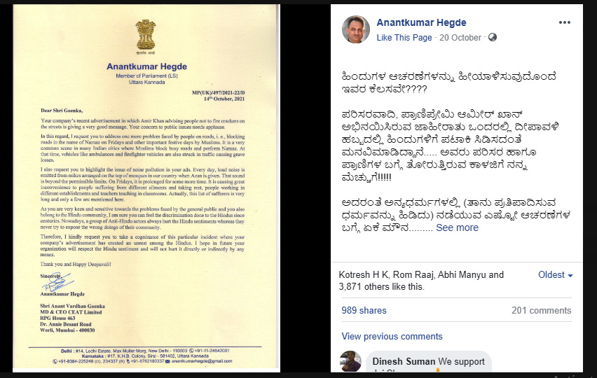 ಪರಿಸರ ಮತ್ತು ಪ್ರಾಣಿಗಳ ಬಗ್ಗೆ ಅಮೀರ್ ಖಾನ್ ಕಾಳಜಿ ವ್ಯಕ್ತ ಪಡಿಸುತ್ತಿರುವುದಕ್ಕೆ ನನ್ನ ಮೆಚ್ಚುಗೆಯಿದೆ. ಆದರೆ ಅನ್ಯ ಧರ್ಮದಲ್ಲಿ ನಡೆಯುತ್ತಿರುವ ಹಲವು ಆಚರಣೆಗಳ ಬಗ್ಗೆ ಅವರೇಕೆ ಮೌನವಾಗಿದ್ದಾರೆ? ಪಟಾಕಿ ರಸ್ತೆ ಮೇಲೆ ಹೊಡೆಯುವುದರಿಂದ ಸಮಸ್ಯೆಯಾಗುತ್ತದೆಂದಾರೆ, ರಸ್ತೆ ಮೇಲೆ ನಮಾಜ್ ಮಾಡುವುದರಿಂದಲೂ ಟ್ರಾಫಿಕ್ ಸಮಸ್ಯೆಯಾಗತ್ತದೆ. ಧ್ವನಿವರ್ಧಕದಲ್ಲಿ ಆಝಾನ್ ಕೂಗುವುದರಿಂದ ಶಬ್ಧ ಮಾಲಿನ್ಯವಾಗುತ್ತದೆ. ಅದನ್ನೂ ಜಾಹೀರಾತಿನಲ್ಲಿ ತೋರಿಸಿರಿ, ಪ್ರತಿ ದಿನ ಬೆಳಗ್ಗೆ ಚೀರುವ ಧ್ವನಿ ವರ್ಧಕಗಳು, ನಡು ರಸ್ತೆಯಲ್ಲಿ ನಮಾಜ್ ಮಾಡುವುದು ಮತ್ತಿತರ ಆಚರಣೆಗಳತ್ತ ಅಮೀರ್ ಲಕ್ಷವಹಿಸಿದರೆ ಎಷ್ಟೋ ಸಮಸ್ಯೆ ಬಗೆಹರಿಯುತ್ತವೆ ಎಂದು ಅನಂತ ಹೆಗಡೆ ಸಿಯೆಟ್ ಕಂಪನಿ ಮಾಲೀಕರಿಗೆ ಬರೆದಿರುವ ಪತ್ರದಲ್ಲಿ ಹೇಳಿದ್ದಾರೆ.